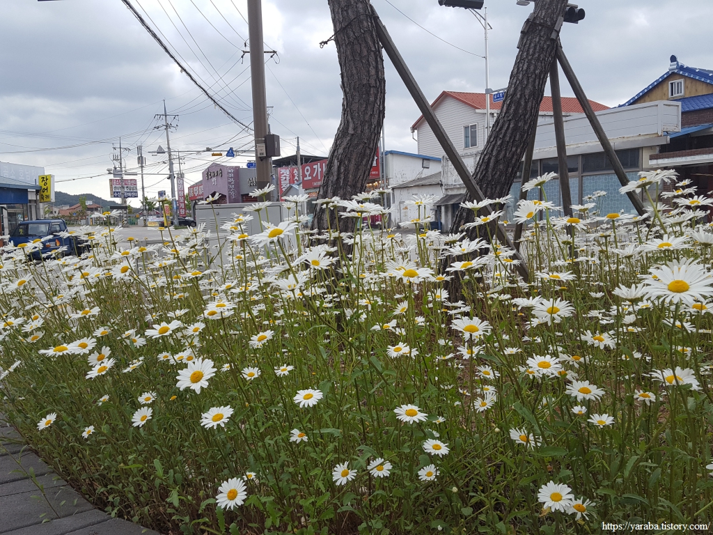 5월 중순에 다시 돌아온 곰소항은 봄의 절정을 넘어서 초여름을 향해 달려가고 있다. 날이 흐려서 비를 맞지 않을까 하는 염려가 있지만 구름이 해를 가려 주어서 걷기에는 좋은 날씨가 되지 않을까 싶다. 흰색과 노란색이 마치 계란 프라이처럼 생겨서 계란꽃이라는 별칭을 가진 샤스타데이지가 화사하게 우리를 맞아준다.