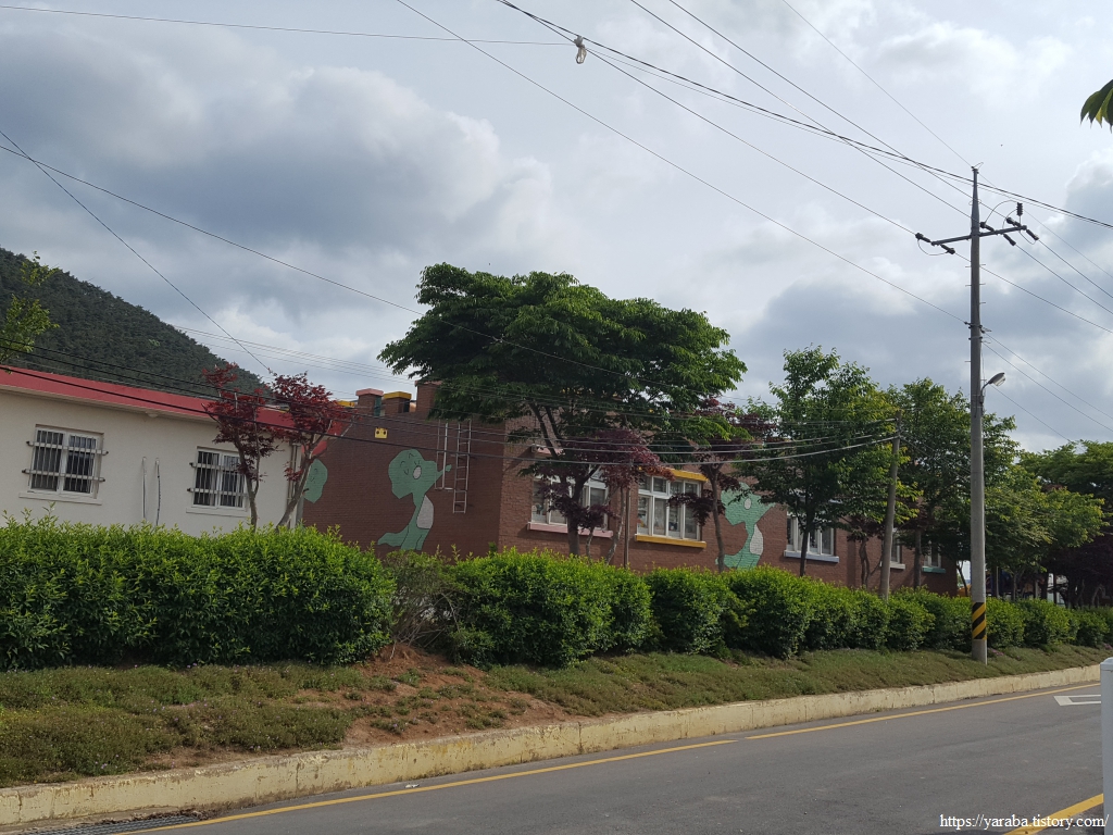 청자로 도로를 따라 걷는 길은 곰소초등학교 앞을 지나서 작도마을에 닿는다. 읍내에서 떨어진 곳이라서 그런지 학생수가 30여 명인 아담한 학교이다. 이곳도 교직원수가 학생수와 비슷한 학교이다. 빨간 벽돌 학교 벽에 둘리를 그려 놓았다.
