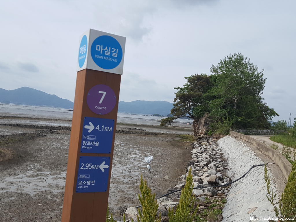 잘 정비된 변산 마실길 덕분에 기분 좋은 걷기를 이어갈 수 있다. 왕포마을을 4.1Km 앞두고 있다. 변산 마실길 7코스는 곰소항에서 왕포마을까지로 "곰소 소금밭길"이라는 별칭을 가지고 있다.