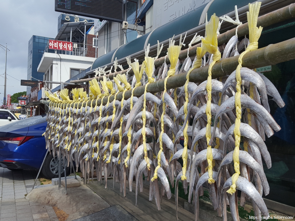 지난번 곰소항에 도착하면서 만난 곰소항의 풀치 건조 풍경은 다시 보아도 생경스럽다. 영광 법성포를 지나와서 그런지 굴비 말리는 풍경과 비슷해 보이지만 확실히 다르다. 어린 갈치를 염장해서 말린 것이다. 머리를 잘라 버리고 내장 부분은 깔끔하게 잘라서 따로 갈치 속젓을 담근다고 한다.