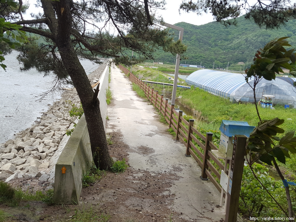 도로에 오르니 멀리 국립변산자연휴양림으로 이어지는 제방도 보인다. 변산마실길 6코스 표식과 국도 옆의 보행로를 따라 이동한다.
