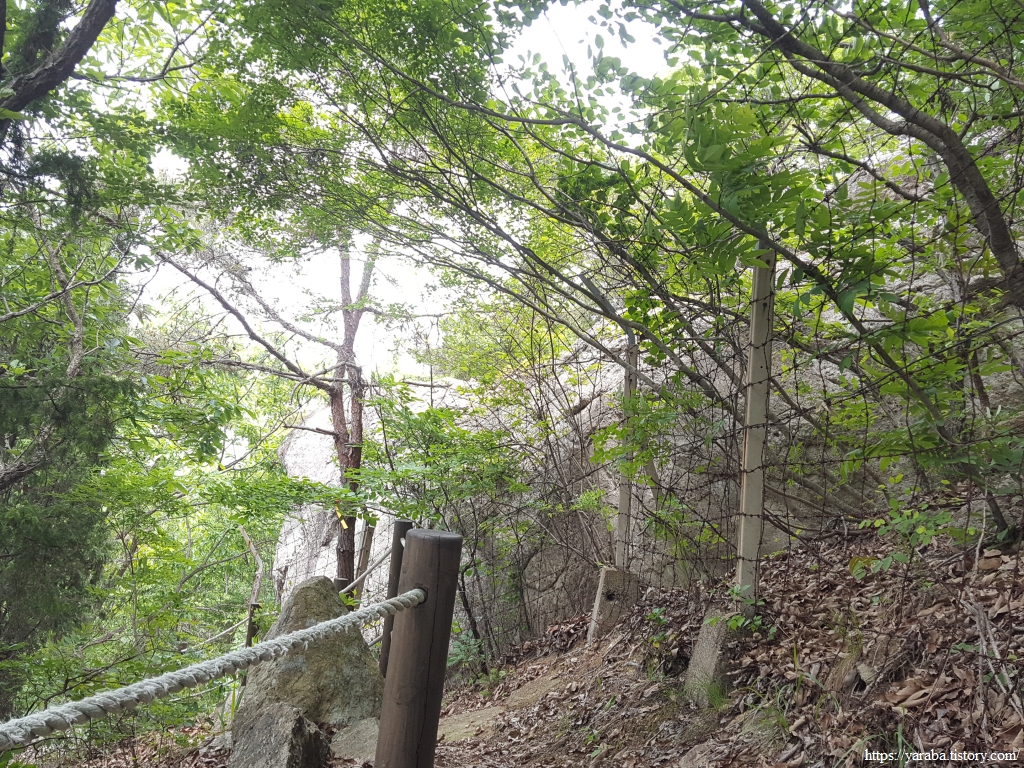 바위 암석과 나무 숲이 어우러진 숲길을 걷는다.