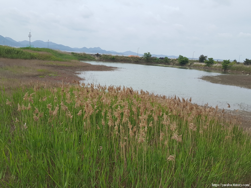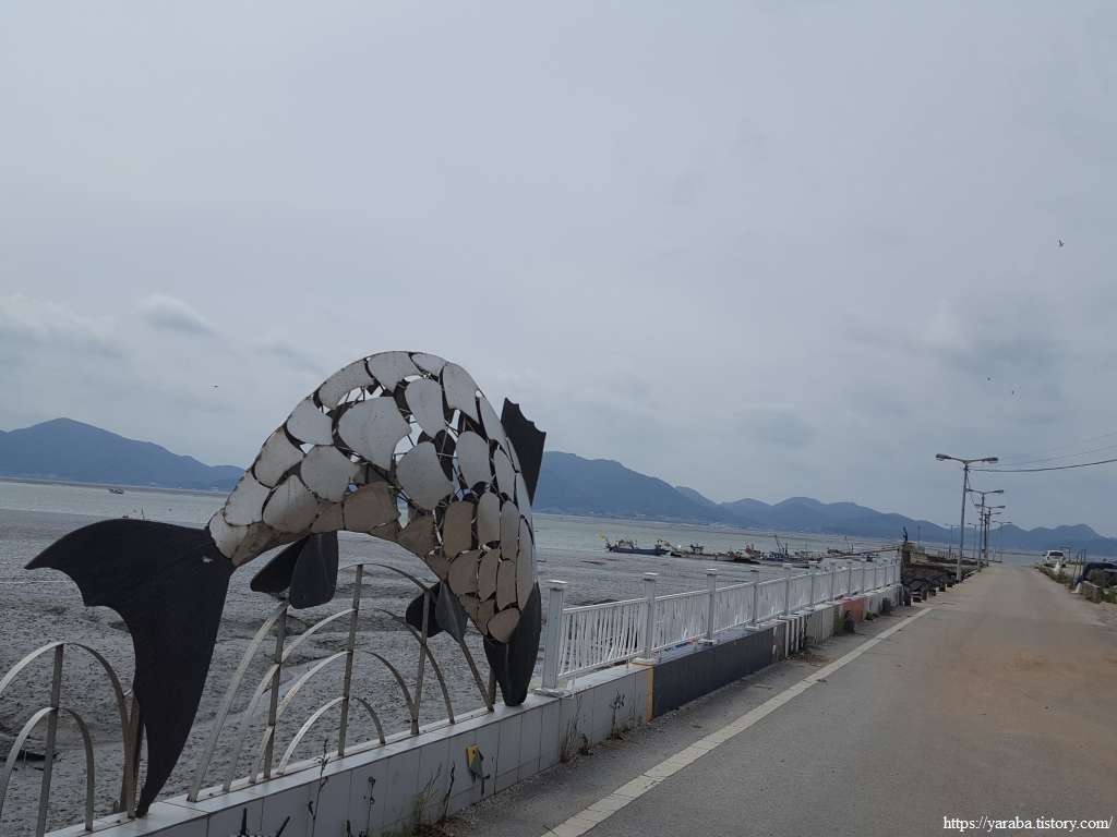 왕포마을을 빠져나가는 길에는 물고기 조형물과 함께 양식장으로 사용했던 공간으로 보이는 장소를 지난다. 어선이 양식장 안쪽에 들어와 있는 것을 보면 둑을 개방한 모양인데 자세한 사정은 모를 일이다.