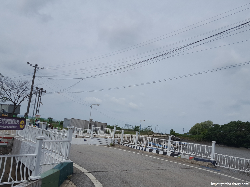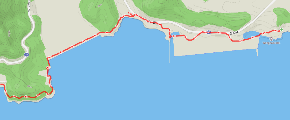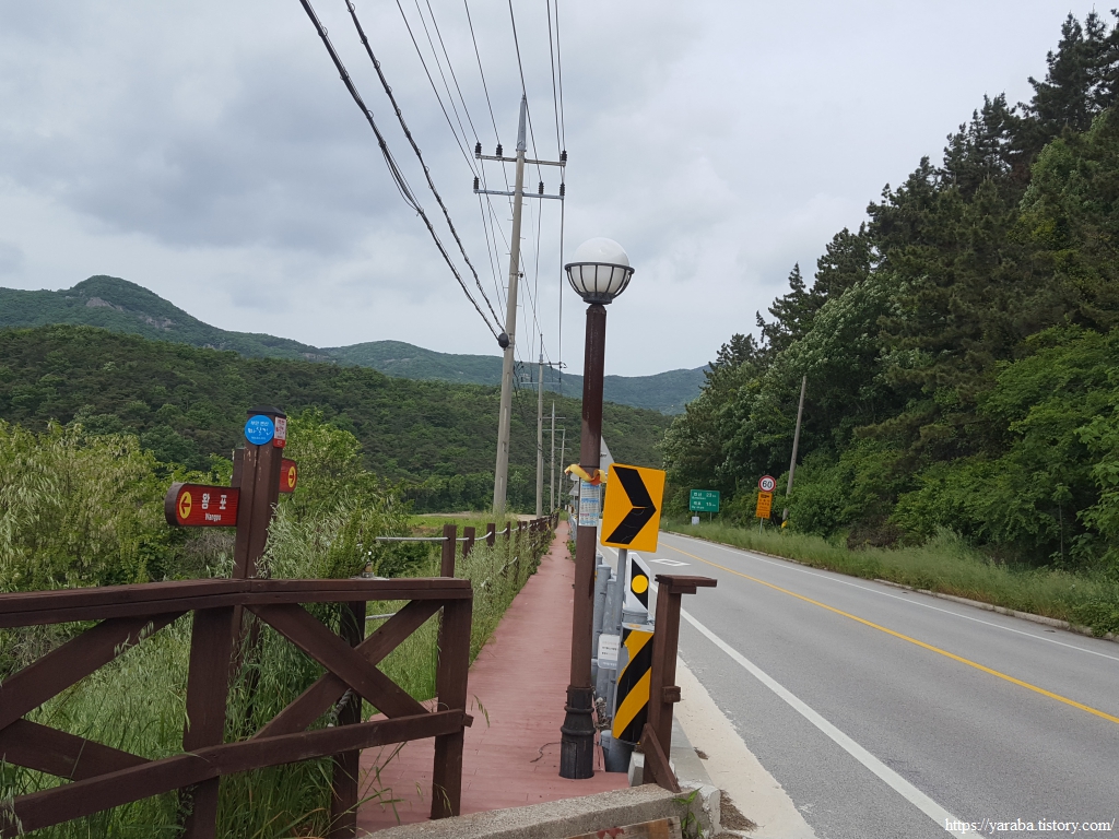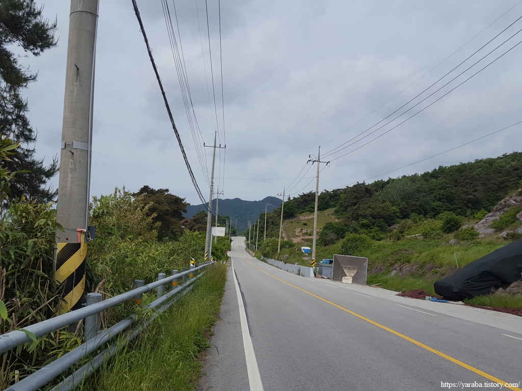 청자로 도로 자체가 산자락 아래의 해안을 따라가다 보니 도로 아래는 절벽에 가깝다. 도로 아래로 휴양림으로 이어지는 제방길과 연결되는 작은 인도교도 보인다.