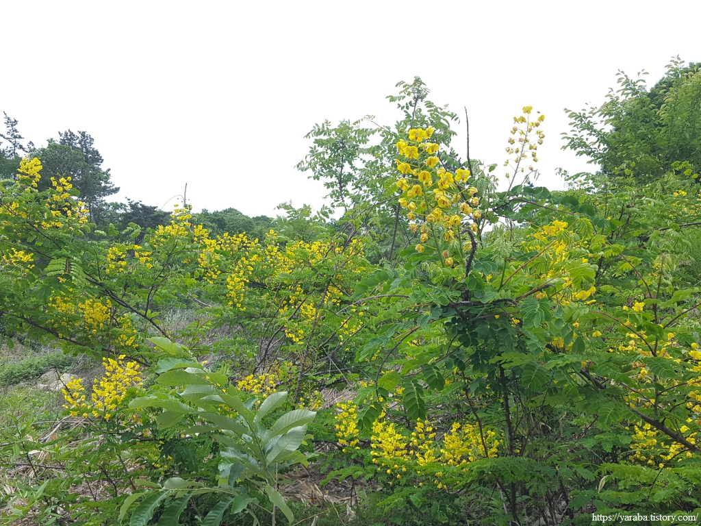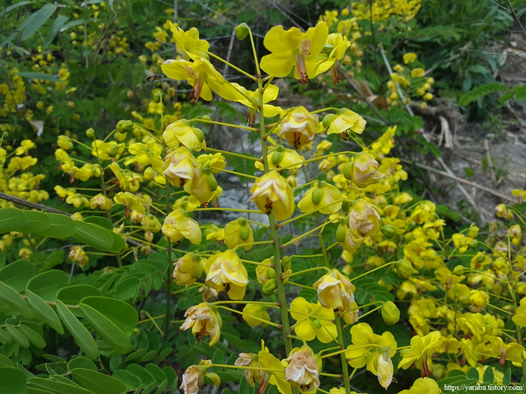잎 모양이 아카시 나무와 비슷해서 항상 그 정체를 알고 싶어 했는데, 노란 꽃을 피우니 확실히 그 정체를 알 수 있게 되었다. 실거리나무이다. 식물 분류상 과도 아카시 나무와 다르다. 나무 전체에 가시가 많아서 옷의 실밥이 잘 걸린다은 의미라고 한다. 아카시 나무는 하얀 꽃을 아래로 떨구지만 실거리나무는 노란 꽃을 위로 피운다.