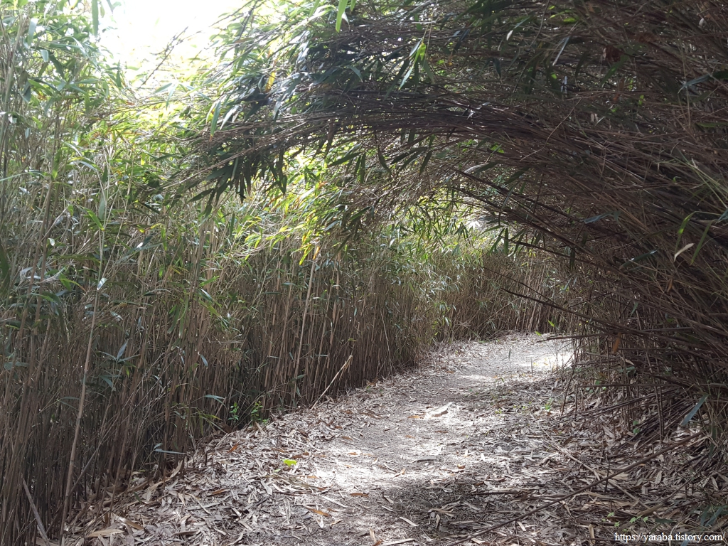 도로에서 계단길을 내려와 둑방길을 가로지르면 휴양림으로 이어지는 숲길로 진입할 수 있다.