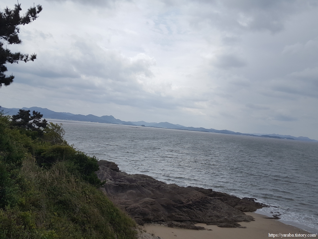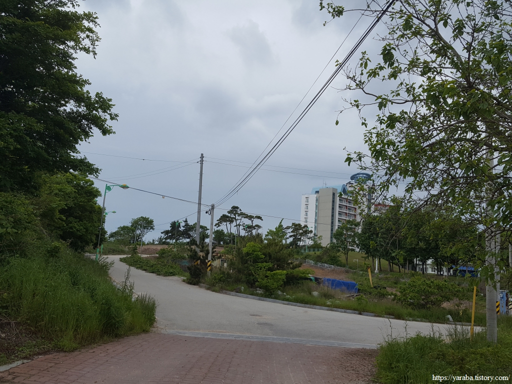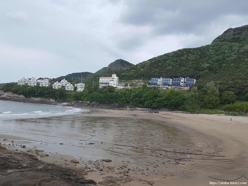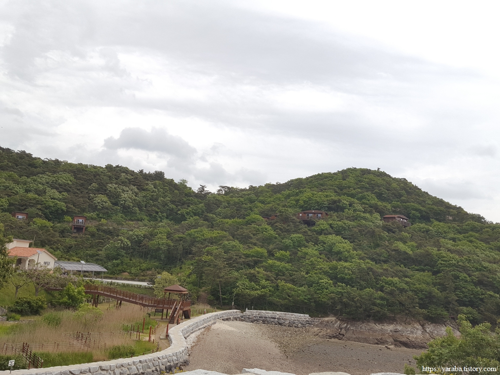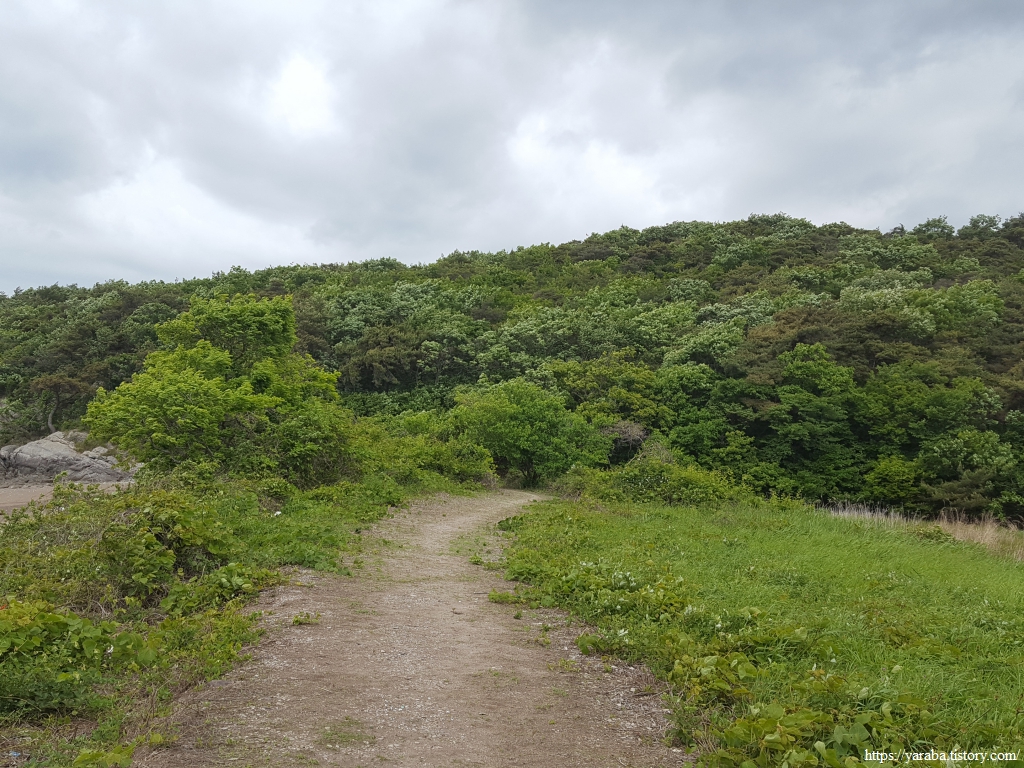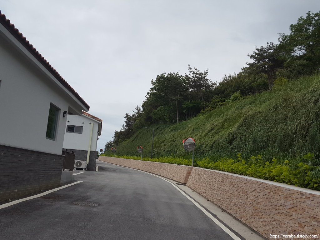 길은 휴양림 앞 해변을 가로질러 건너편 산으로 올라간다. 깔끔하게 지어진 숙소들 옆을 지나는 길이다. 가족단위로 차를 가지고 오면 독채 숙소 옆에 세우고 좋은 바다 전망을 보며 쉬어가기 좋겠다는 생각이 들었다.