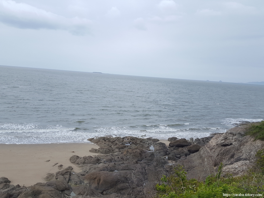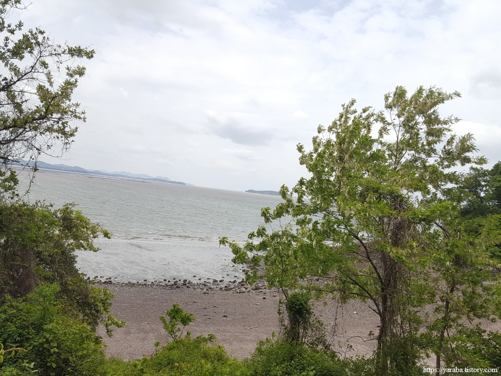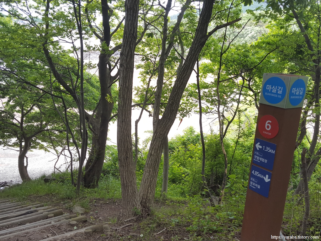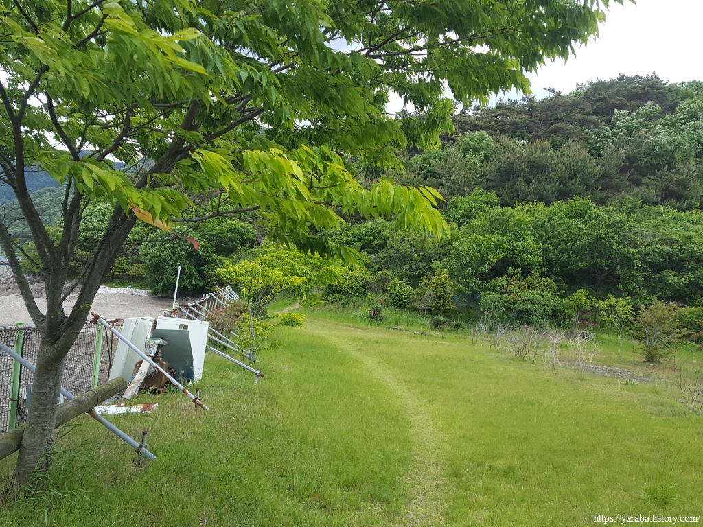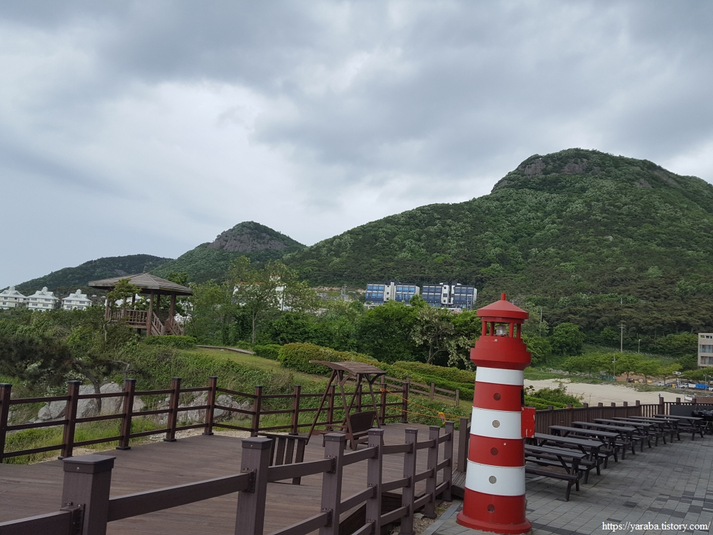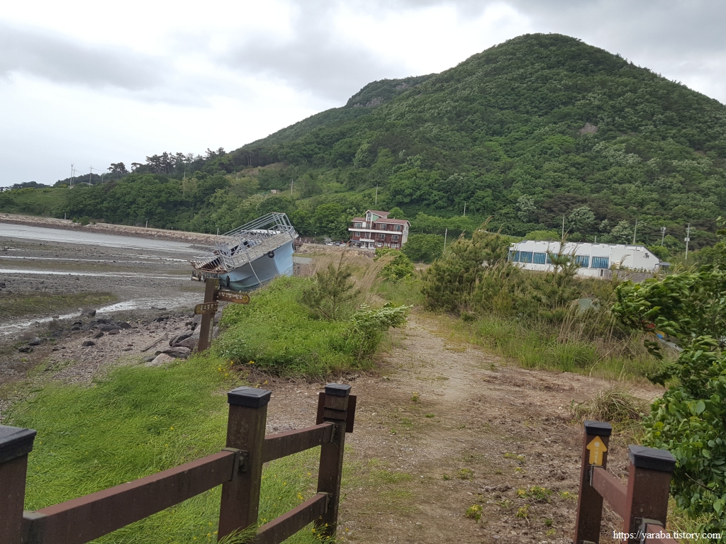 길은 휴양림 앞 해변을 가로질러 건너편 산으로 올라간다. 깔끔하게 지어진 숙소들 옆을 지나는 길이다. 가족단위로 차를 가지고 오면 독채 숙소 옆에 세우고 좋은 바다 전망을 보며 쉬어가기 좋겠다는 생각이 들었다.