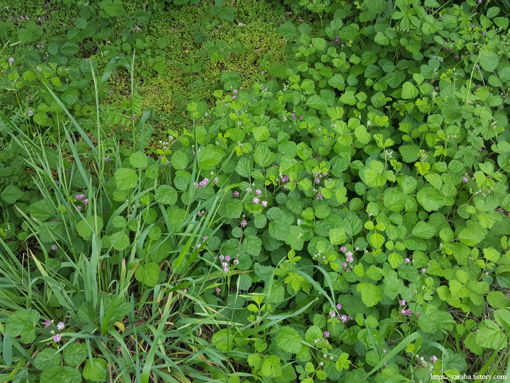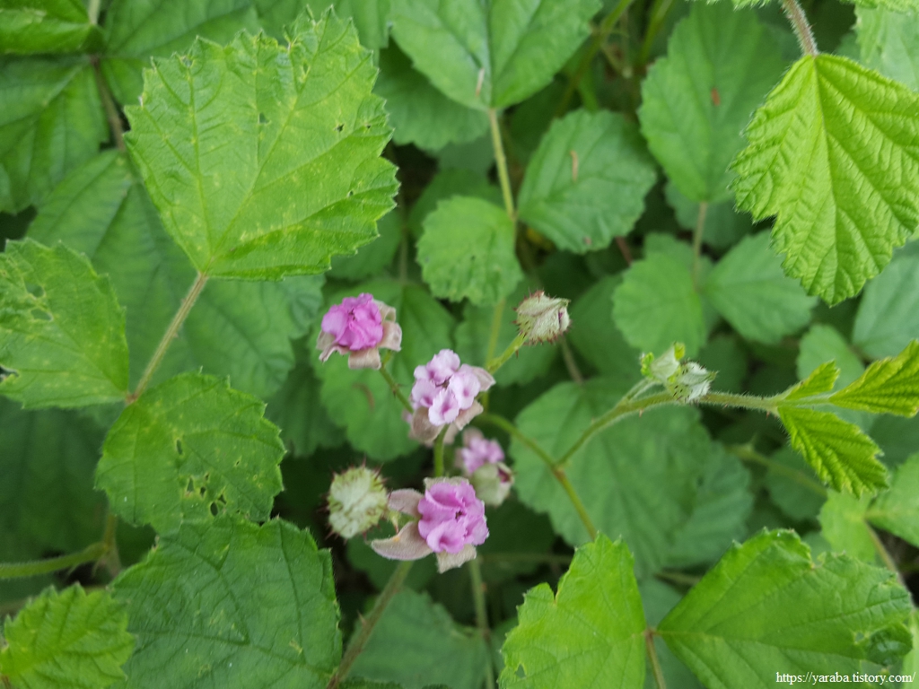 산딸기가 익기에는 조금 이른 시기인가? 산딸기 따먹기 좋아하는 옆지기는 빨간 열매가 없는 산딸기나무 앞에서 아쉬움을 토한다. 산딸기의 한 종류인 멍석딸기가 보라색 꽃을 피웠다.