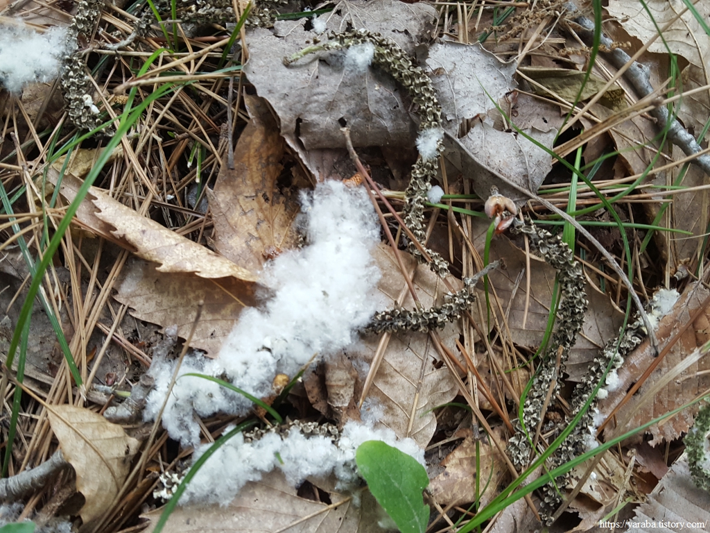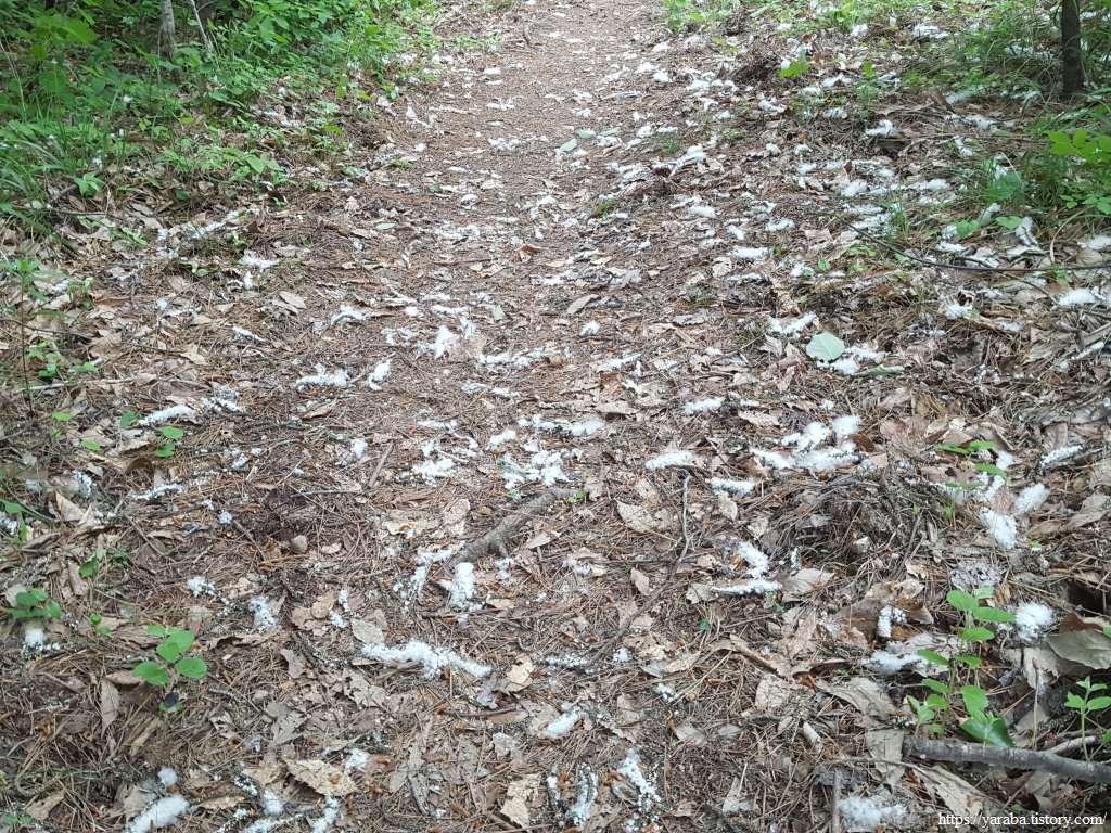 숲길에서 만난 솜털뭉치들. 이 계절이 눈이 내렸을 리는 만무하고 무슨 벌레인가?라고 생각하면 조금 징그럽지만 벌레는 아니고 꽃가루도 아니고 은사시나무의 열매라고 한다. 버드나무과라서 그런지 솜털에 씨앗을 날려 보내는 방식이 비슷하다.