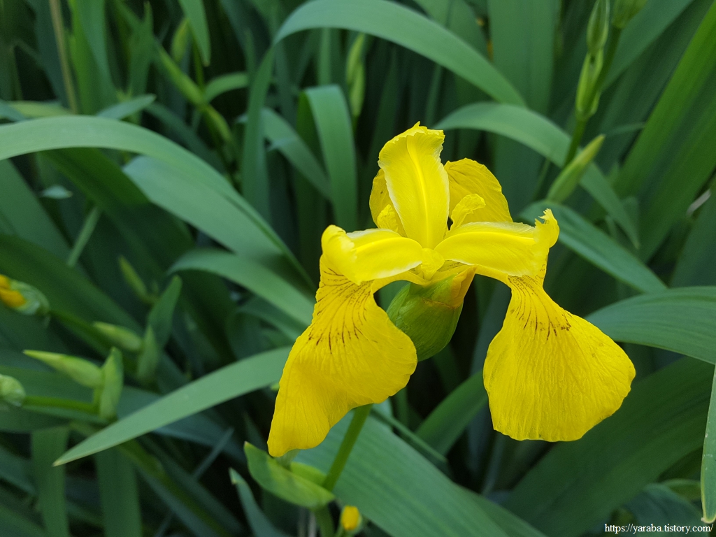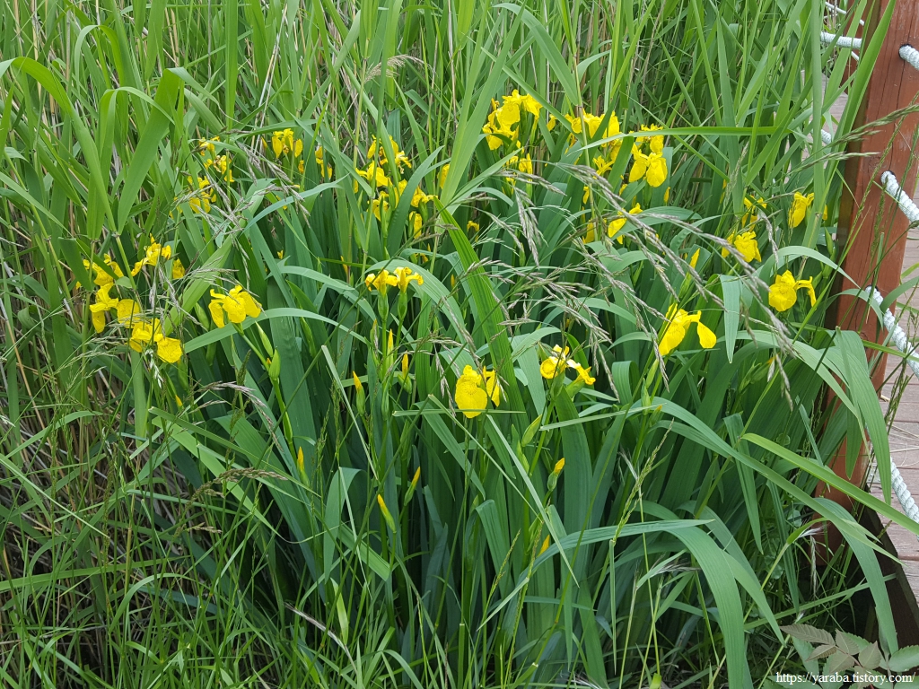 노랑꽃창포라는 유럽이 원산지인 식물이다. 잎사귀는 물 웅덩이에서 보던 우리네 창포와 닮았지만 창포물에 머리 감던 그 창포는 아니다. 그래도 숲과 갯벌의 단조로운 색상만 보다가 밝은 노란색을 보니 눈이 확 떠진다.
