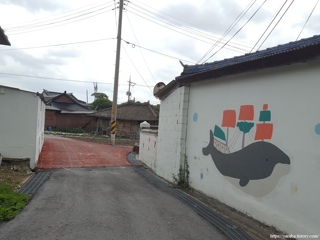 길은 모항마을을 가로질러 내려간다. 마을벽화에 고래와 범선을 합쳐 놓았다. 여러 마을 벽화에 고래가 등장하는 것을 보면 자주 볼 수 없는 동물임에도 친숙한 동물이고 사람의 상상력을 자극하는 동물이 아닌가 하는 생각도 든다.