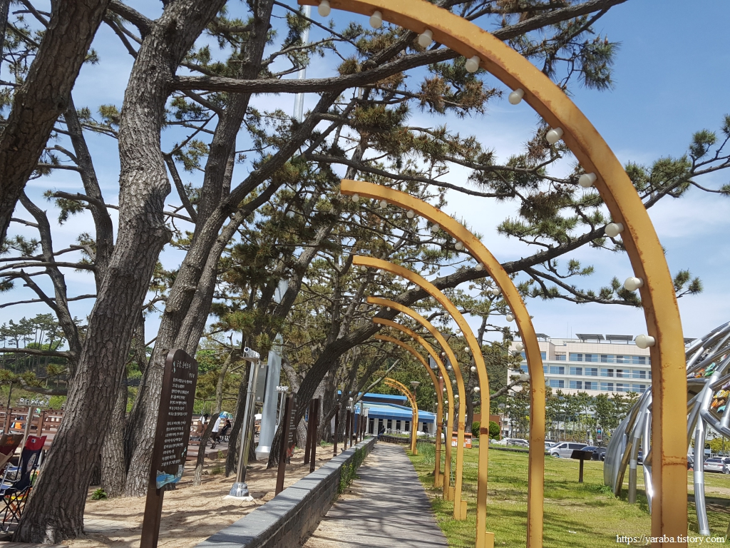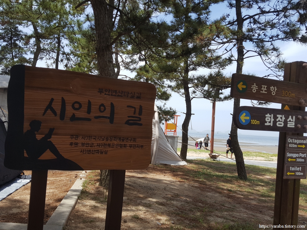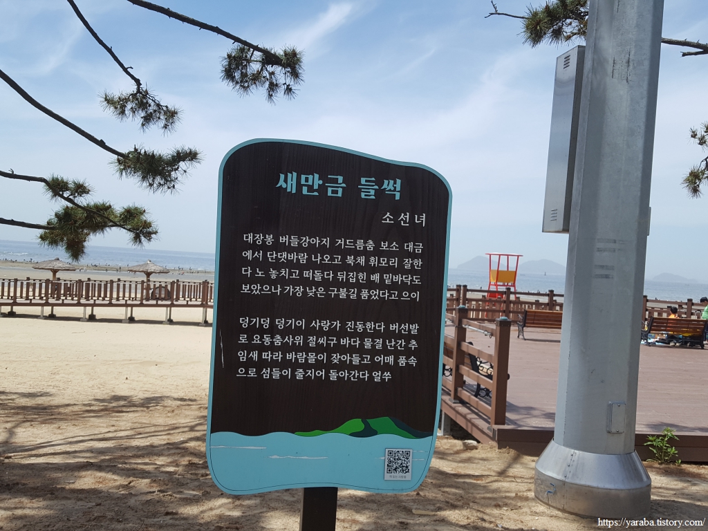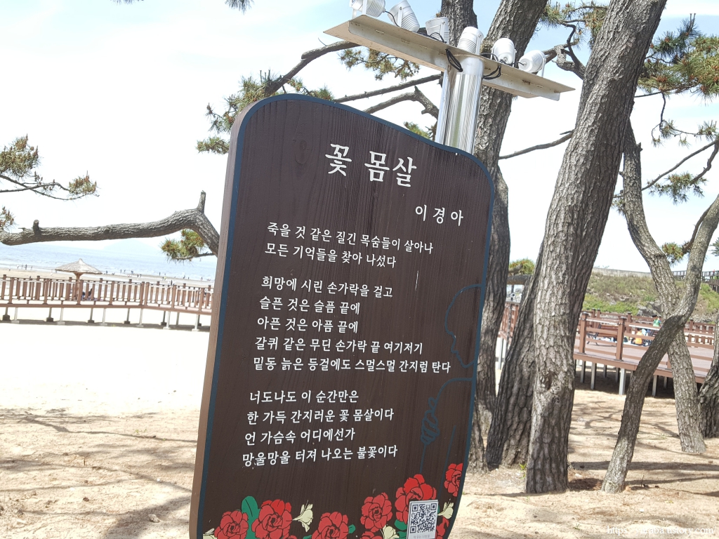 해수욕장 솔숲을 가로지르는 길에는 시인의 길, 작가의 뜨락이라는 표식도 붙어 있다. 전북 작가들의 작품들을 알리고자 하는 의도로 조성했다고 한다. 뜨락은 집 주위의 빈 공간을 의미한다. 누군가는 뜨락이 북한에서 쓰는 말이라고 마당이나 뜰로 바꾸어 써야 한다는 주장을 하는데 어릴 적부터 자주 쓰던 말인데 말에도 근거 없이 이념의 잣대를 들이대나 싶다. 하지만 뜨락은 표준말로 등록된 단어이다.