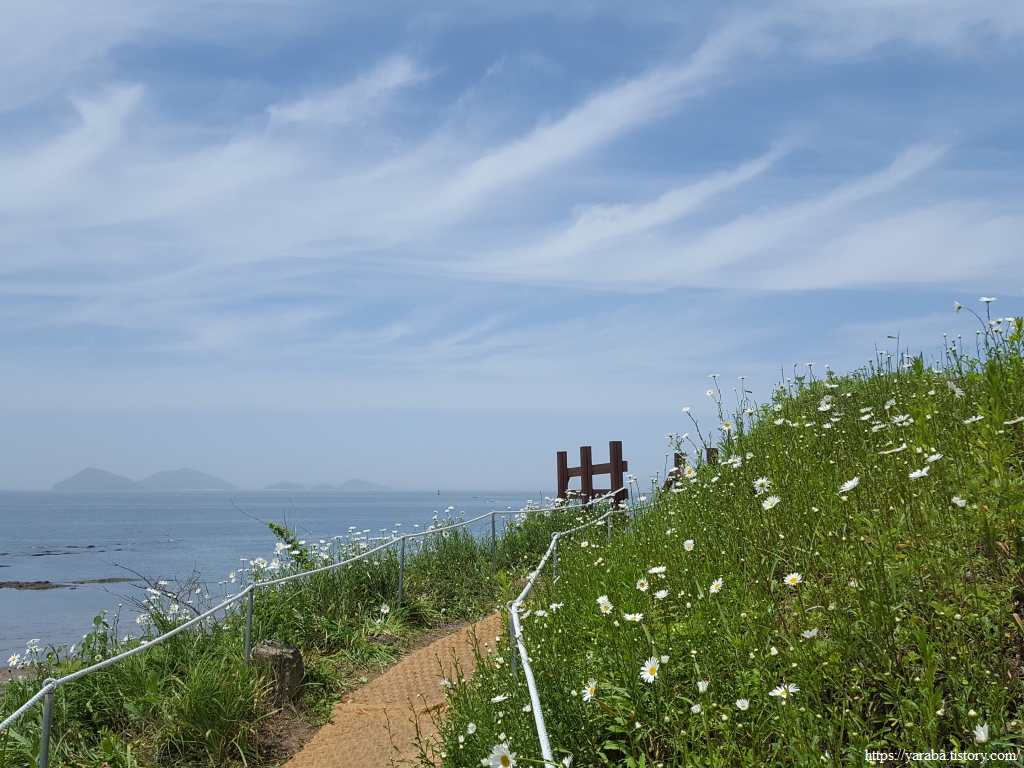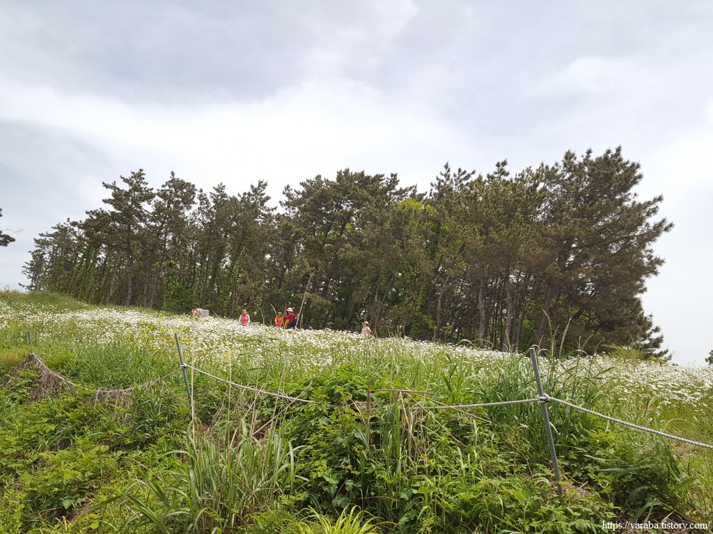 나무가 없는 약간의 공터다 싶으면 어김없이 샤스타데이지의 꽃물결이 등장한다. 푸른 하늘과 바다를 배경으로 한 동산의 샤스타데이지 꽃밭 풍경은 정말 일품이다.