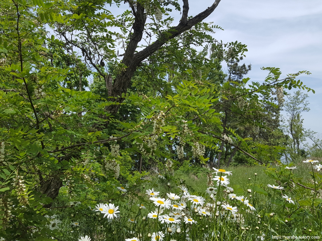 송포항으로 향하는 길, 이곳에도 해안 공터에 자리한 샤스타데이지를 즐기는 사람로 북적인다. 이제는 샤스타데이지를 너무 많이 보면서 걸어온 까닭인지 데이지보다는 하얀 아카시 꽃이 더 정겹다.