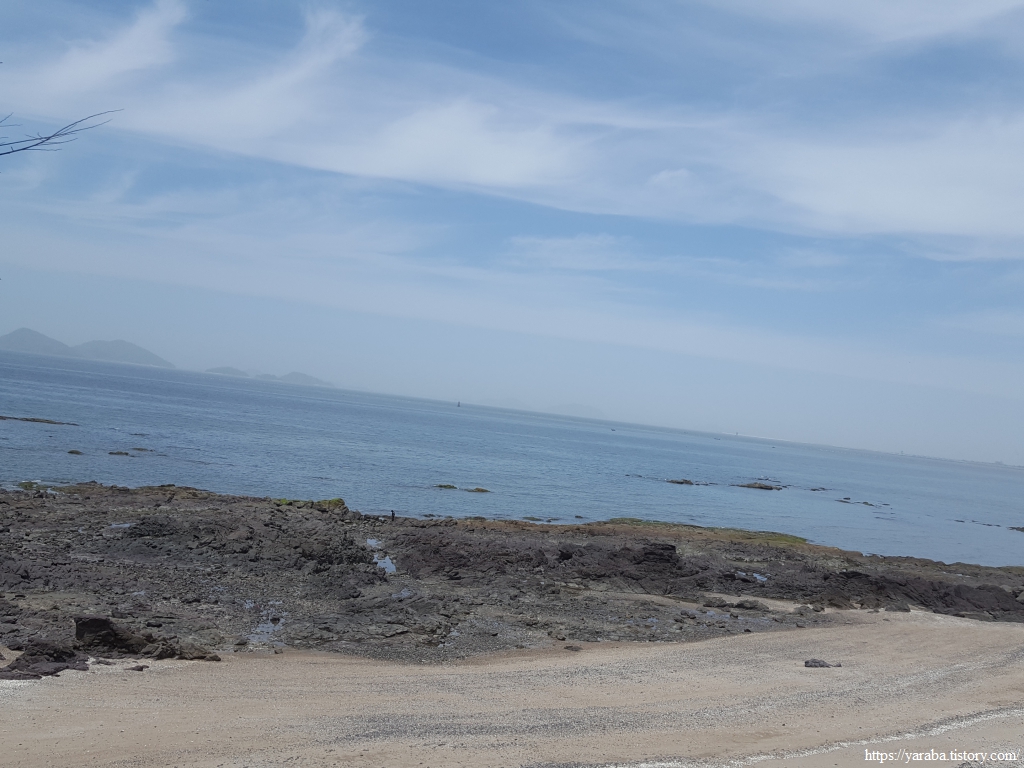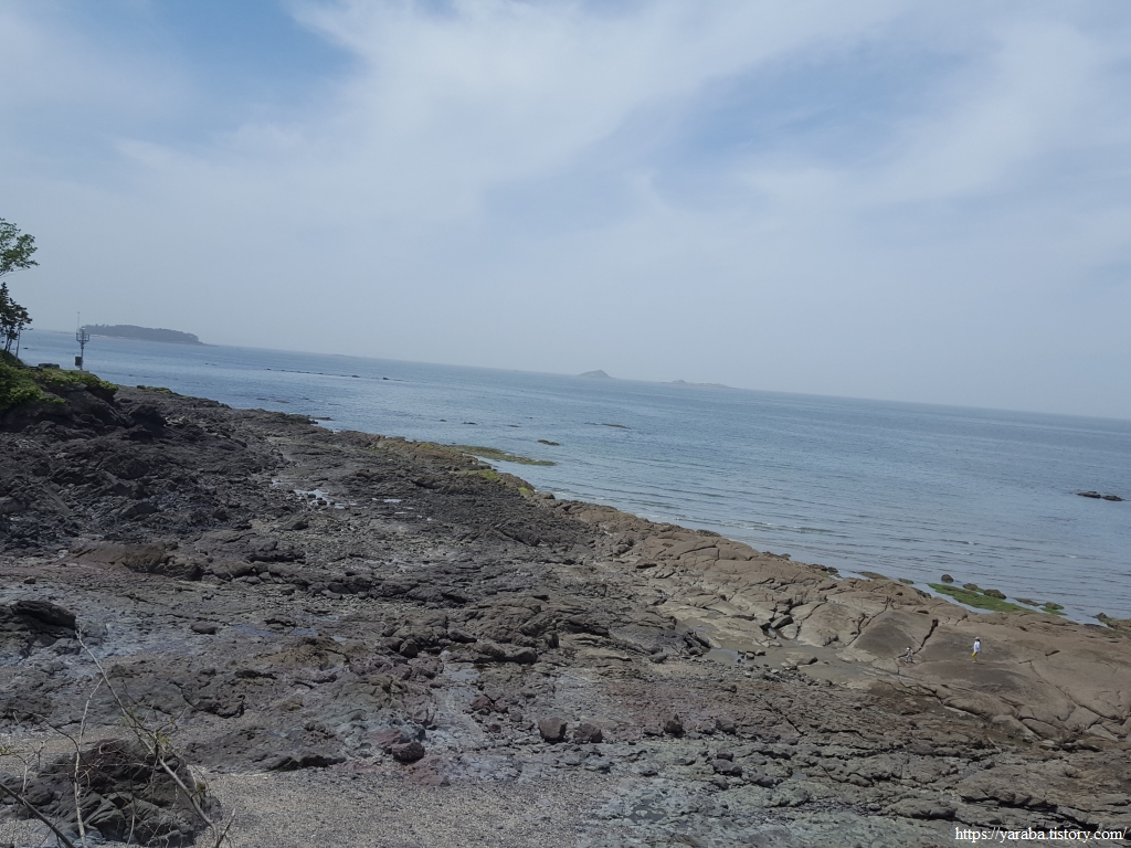 바위 해안으로 이어진 변산 해안 풍경에서 뒤로 보이는 하섬과 사당도, 석도도 이젠 안녕이 아닌가 싶다. 길은 내륙에서 송포항으로 나가는 물길이 있어서 변산 해수욕장으로 바로 갈 수는 없고 송포항 쪽으로 돌아서 가야 한다.