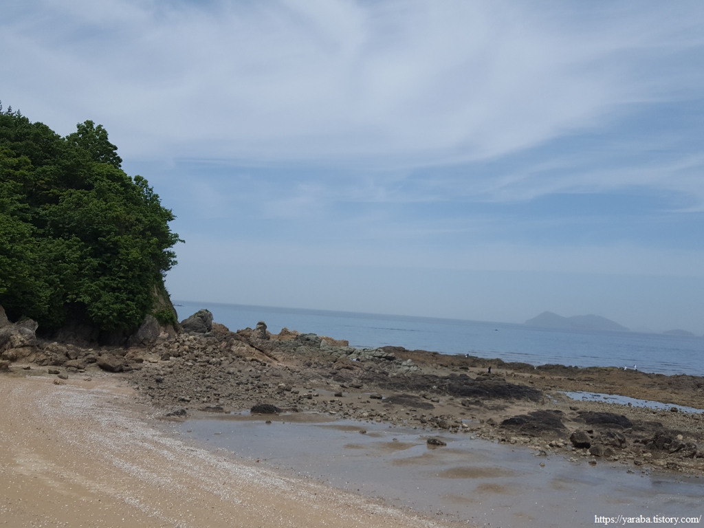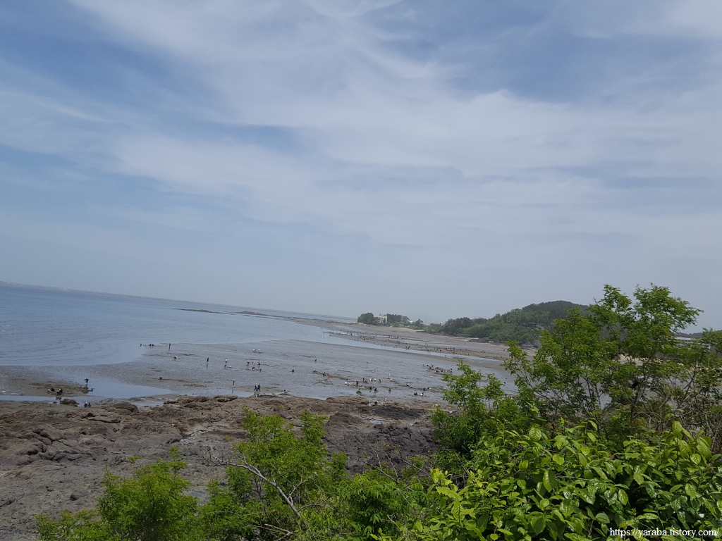 야산 언덕에 올라 고사포 해수욕장을 바라본 모습은 평화로움 그 자체이다. 곳곳으로 봄 나들이 나온 사람들이 많기는 하지만 여름 해수욕장의 북적거림은 없고 누군가는 그냥 바닷물을 발을 담그며 걷는 것으로, 누군가가 모래를 파며 조개를 채집하는 재미로 바다를 즐기고 있다. 바위 절벽 해안선이 품고 있는 모래사장이 평화롭다. 하섬으로 연결되는 바닷길이 열릴 때는 과연 어떤 풍경 일까도 상상해 본다.