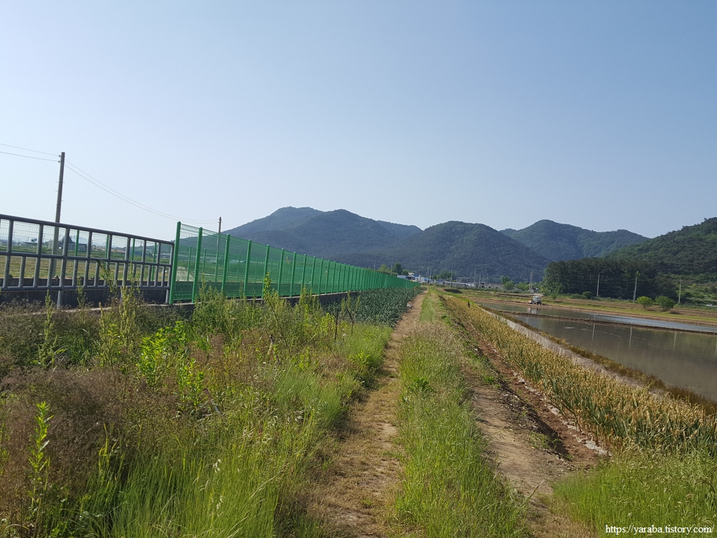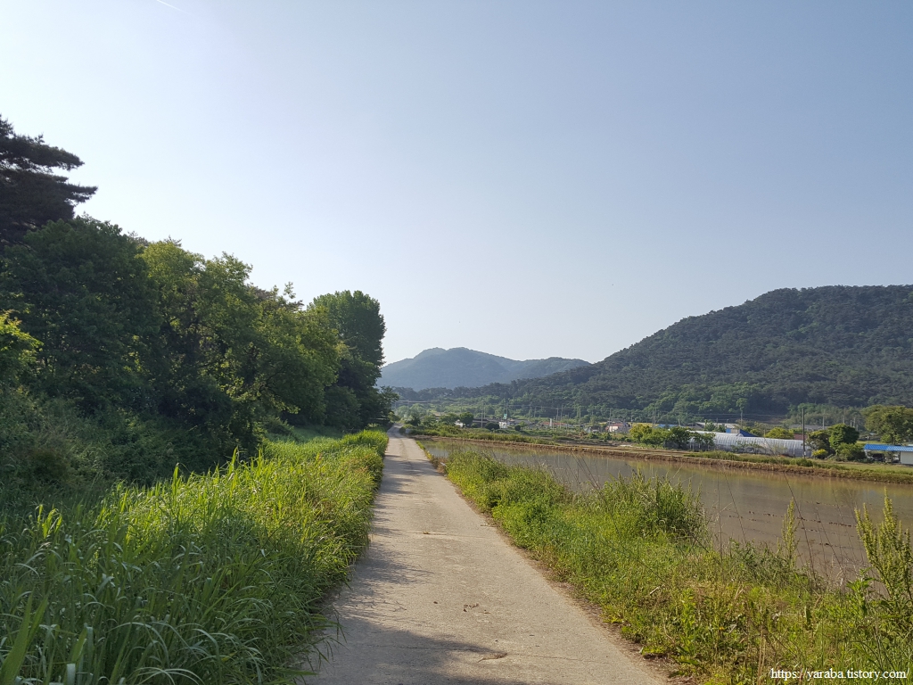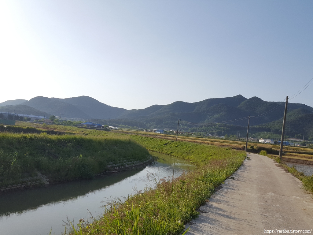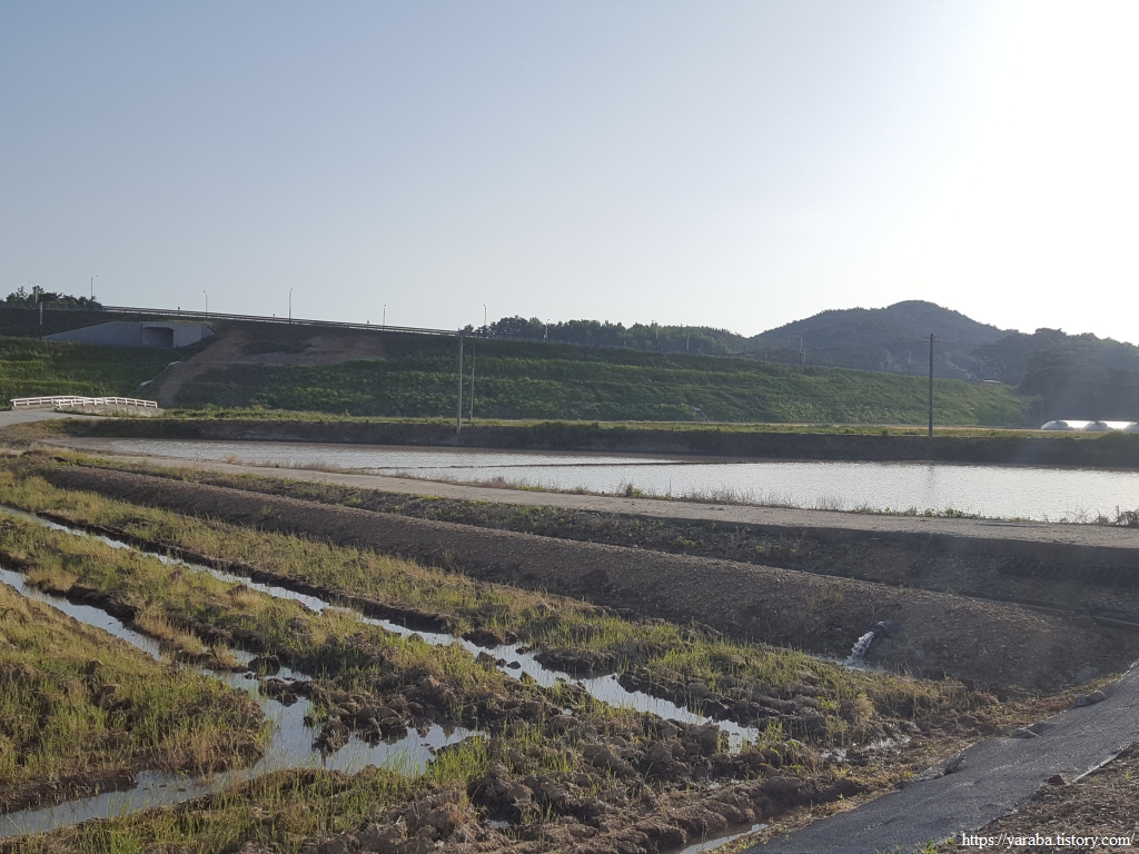 5월 중순을 지나고 있는 시기, 논은 모내기 준비를 위해서 물을 대고 있고 수로에는 들판을 적시는 물이 넉넉하게 흐른다. 눈부신 아침 태양을 정면으로 마주하며 수로를 따라서 동쪽으로 이동한다.