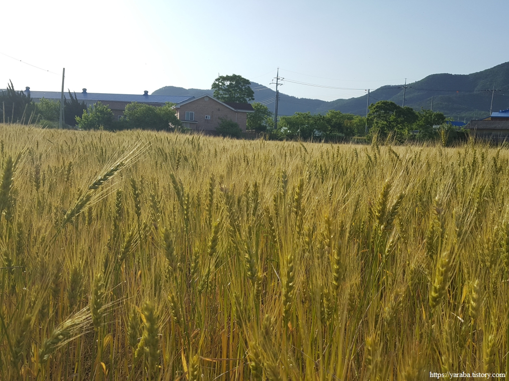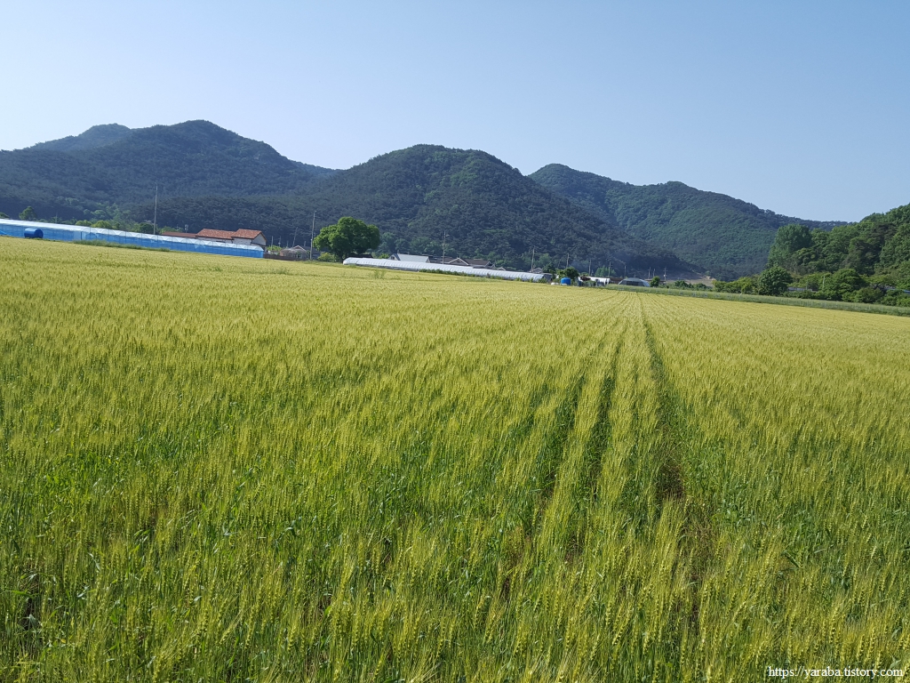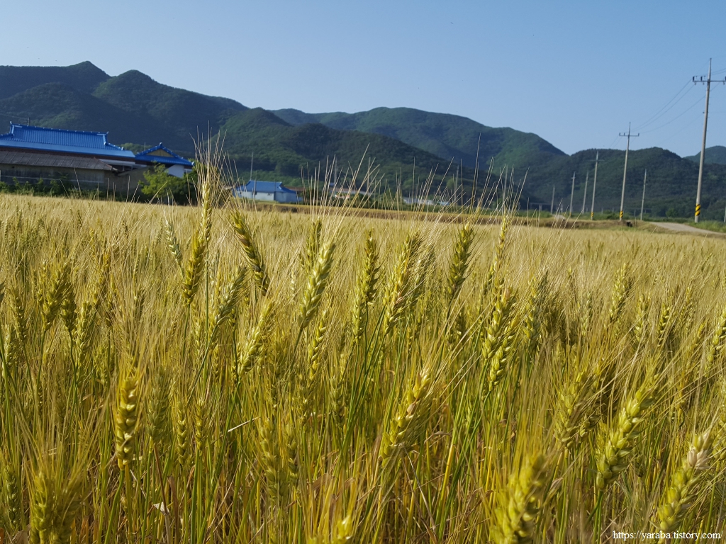 고창군 구간을 지나면서 청보리 물결을 만난 것이 엊그제 같은데 들판의 보리와 밀은 황금물결로 바뀌기 시작했다. 우리밀이 탐스럽게 익어가고 있다.