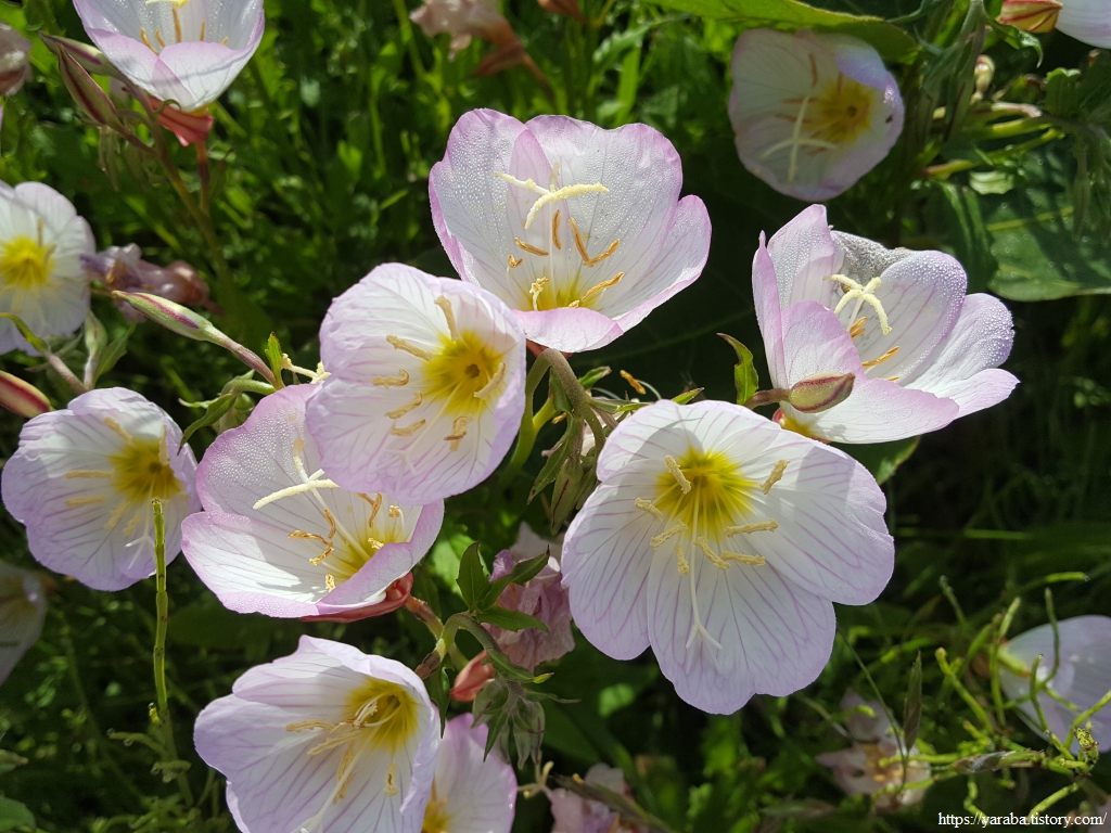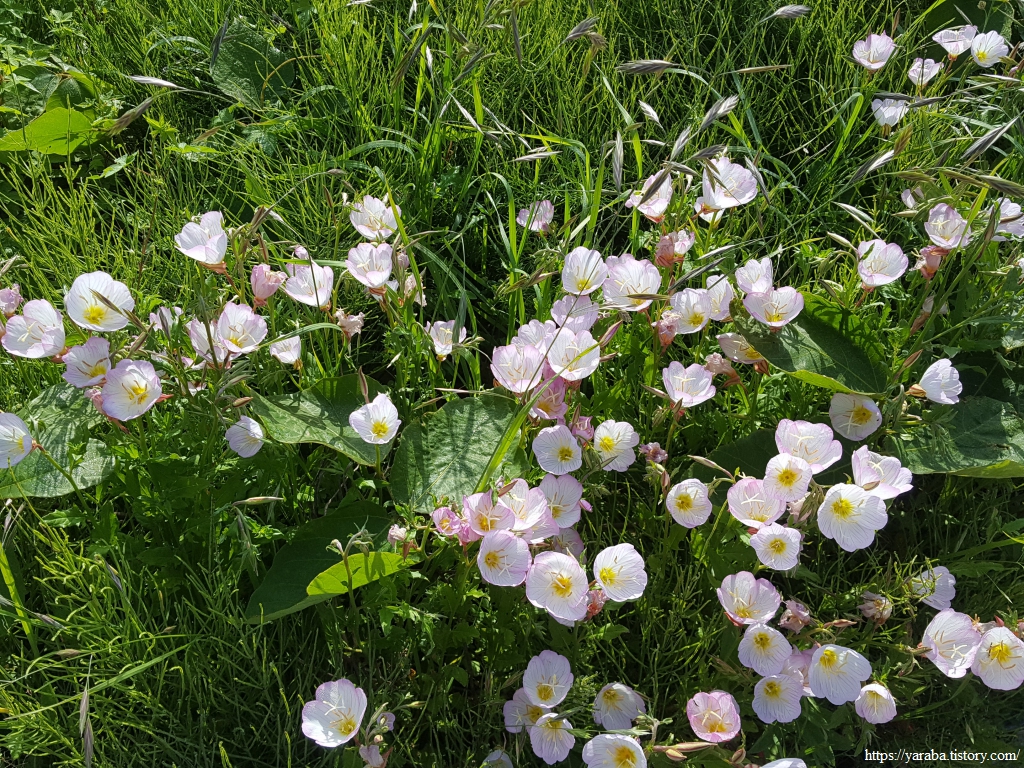 아침햇살을 받은 분홍달맞이꽃이 더 아름답다. 우아한 한복을 연상케 하는 자태를 뽐낸다. 달맞이꽃은 밤에 피지만 이 꽃은 낮에 핀다고 낮달맞이꽃이라고도 불린다.