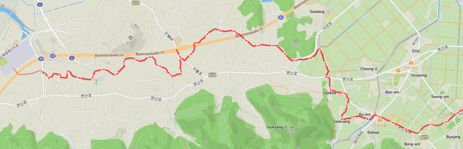 산업단지 끝자락에서 시작하는 49코스는 30번 국도 변산바다로 아래를 지나는 것으로 시작한다. 당분간 바다 구경은 못하고 내륙으로만 들어간다.