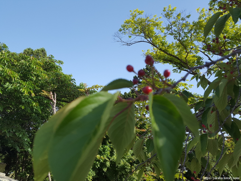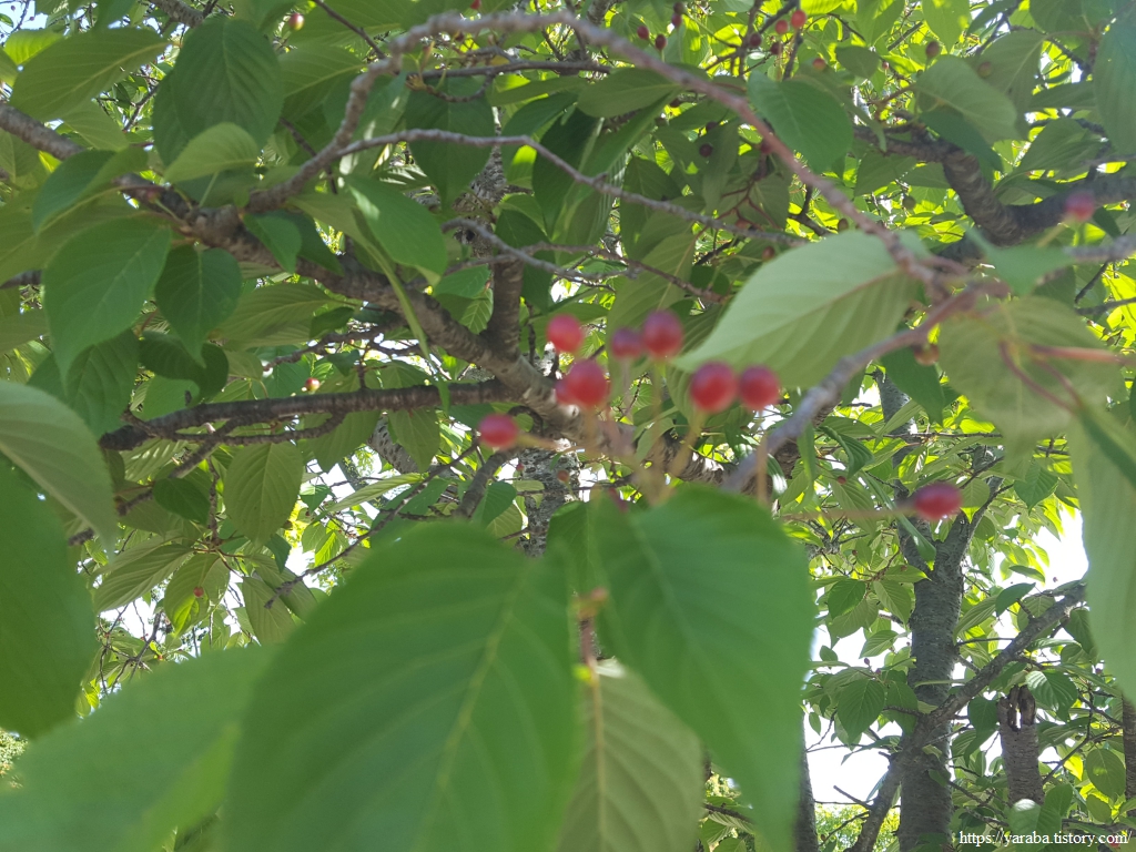 이른 봄 하얀 꽃으로 눈을 즐겁게 했던 벚꽃은 이제 열매가 되어 빨갛게 익어가고 있다. 옆지기는 손에 물이 들어도 쌉싸래하면서도 달콤한 버찌를 기대했지만, 빨간 것만 있고 검게 잘 익은 버찌가 아직 보이지 않아 실망인 모양이다.