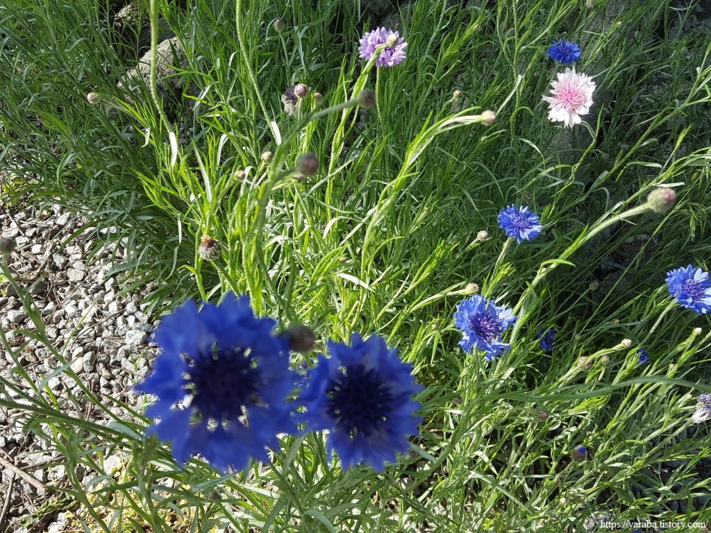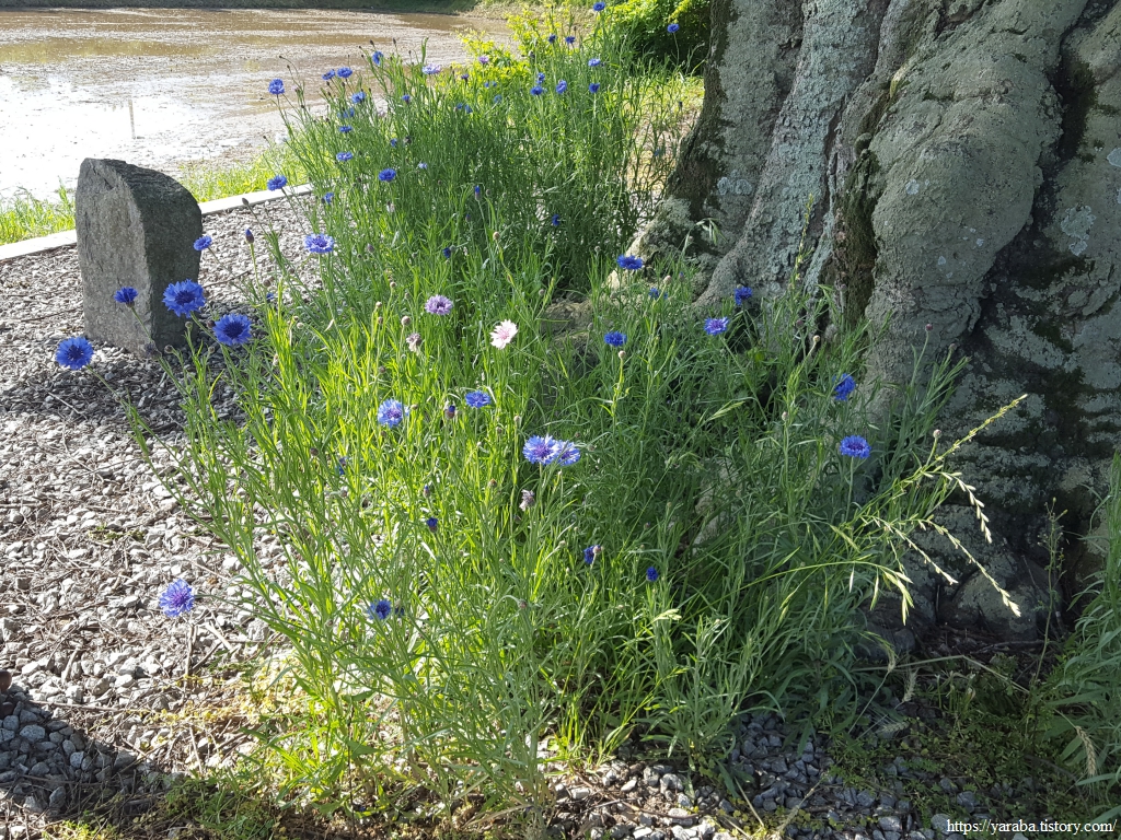 마을의 큰 어른인 나무 아래에는 청초한 수레국화가 수줍게 꽃을 피웠다. 유럽이 원산이지만 거목 아래에서도 잘 어울린다.