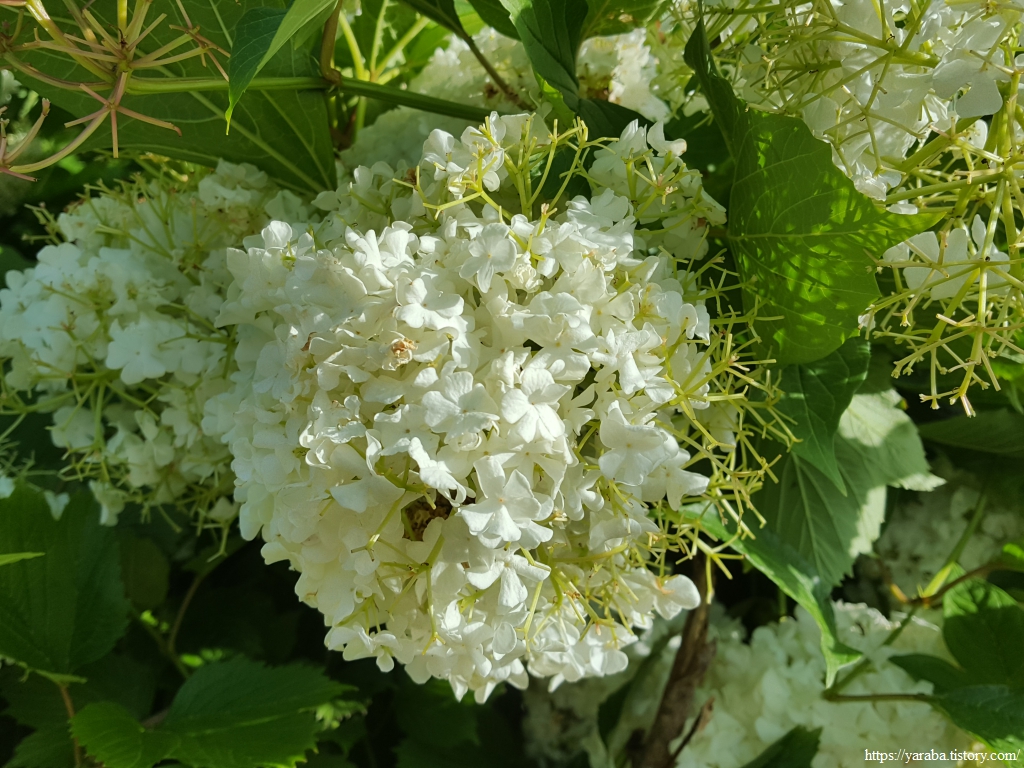 마을길에서 만난 나무수국이다. 땅의 산성도에 따라 다양한 색상의 꽃을 피우는 수국과는 차이가 있다.