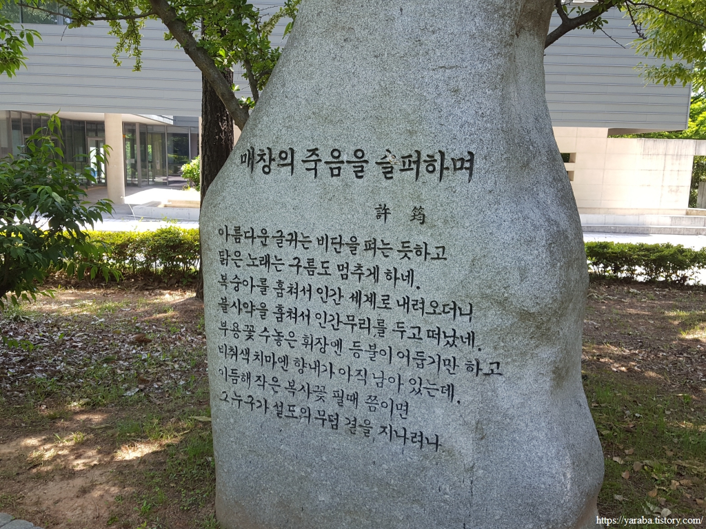 공원을 가로질러 이어가는 길, 이매창과 교분이 있었다는 허균의 시비가 세워져 있었다. "비취색 치마엔 향내가 아직 남아 있는데"하는 그의 시에서 매창의 죽음을 슬퍼하는 그의 마음이 느껴진다.