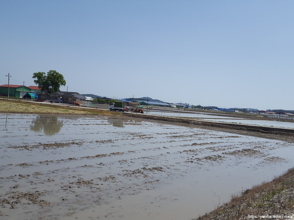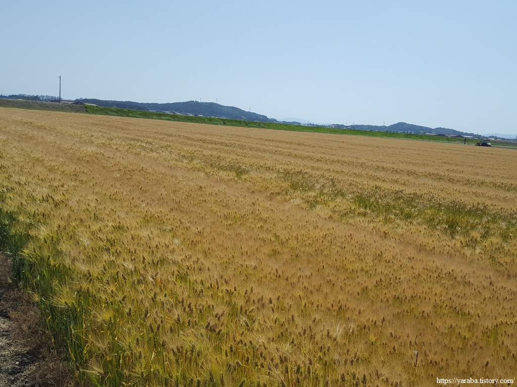 보통의 들판이라면 대부분은 한 가지 모습인데 이곳은 다양한 모습이 펼쳐진다. 어떤 논은 물을 대고 있고, 어떤 논은 써레질까지 끝내고 모내기 직전의 상태인 곳도 있다. 어떤 논은 이앙기가 한참 모를 심는 곳도 있고, 어떤 논은 모내기를 끝내고 물을 잔잔하게 받아 두었다. 그런 논들 사이에서 소먹이 풀이 키를 한참 세워 베기를 기다리는 곳이 있고, 풀을 베어 말리는 곳이 있는가 하면, 보리가 황금물결을 이루고 있는 곳도 있다. 생명의 기운이 넘쳐나는 계절이다.