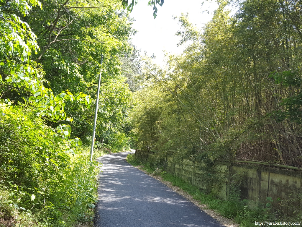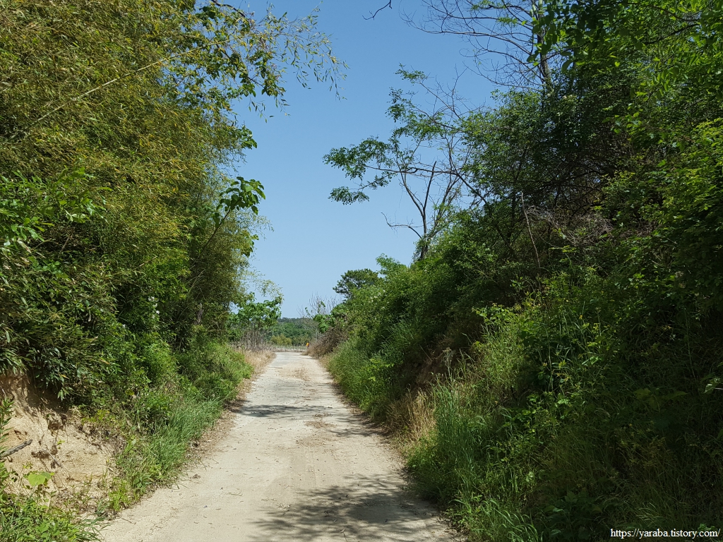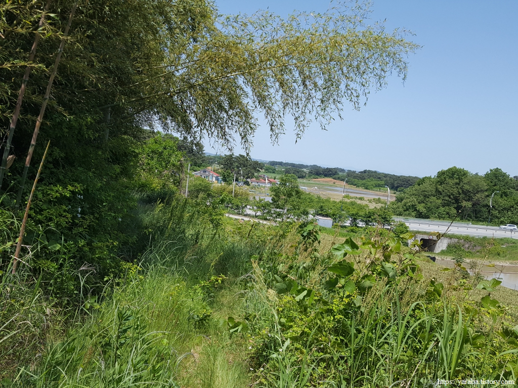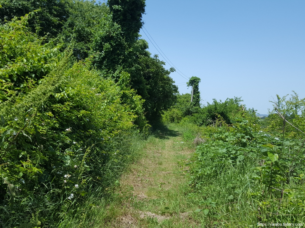 마을 뒤 고개를 넘어가는 길은 사람이 많이 다니지 않는 공간인지 우거진 풀숲을 통과해야 하지만 이런 구간이 길게 이어지지는 않는다. 콘크리트나 아스팔트로 생명의 숨구멍을 막아버린 길이 아니라면 사람이 다니지 않으면 자연스레 길이 없어지는 것이 자연스러운 일이 아닌가 싶기도 하다. 멀리 고개 아래로 보이는 국도를 향해서 내려간다.