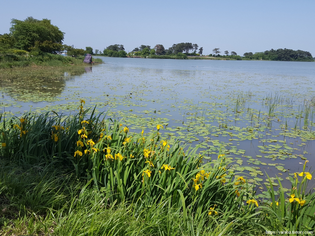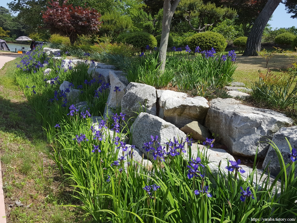 보라색이 인상적인 붓꽃을 비롯하여 수변 공원을 잘 가꾸어 놓았다. 지금은 꽃들이 활짝 피어 있지만, 꽃이 피지 않은 꽃봉오리 모양이 붓처럼 생겼다고 붙은 이름이다. 학명이 그리스어로 아이리스이다.