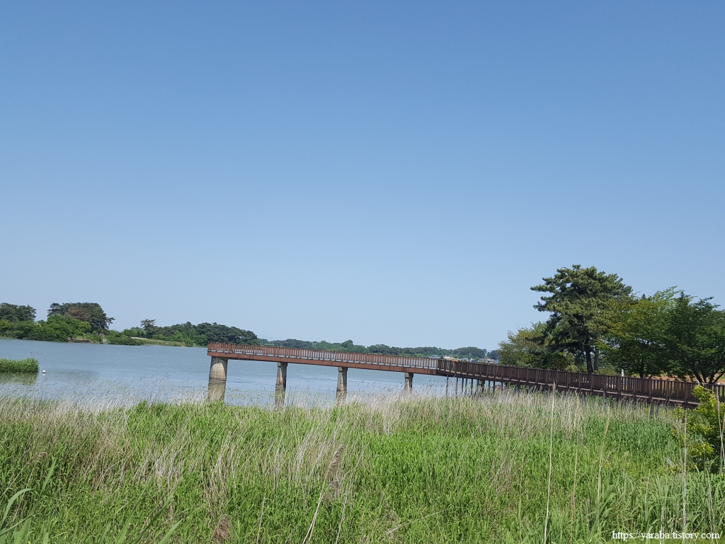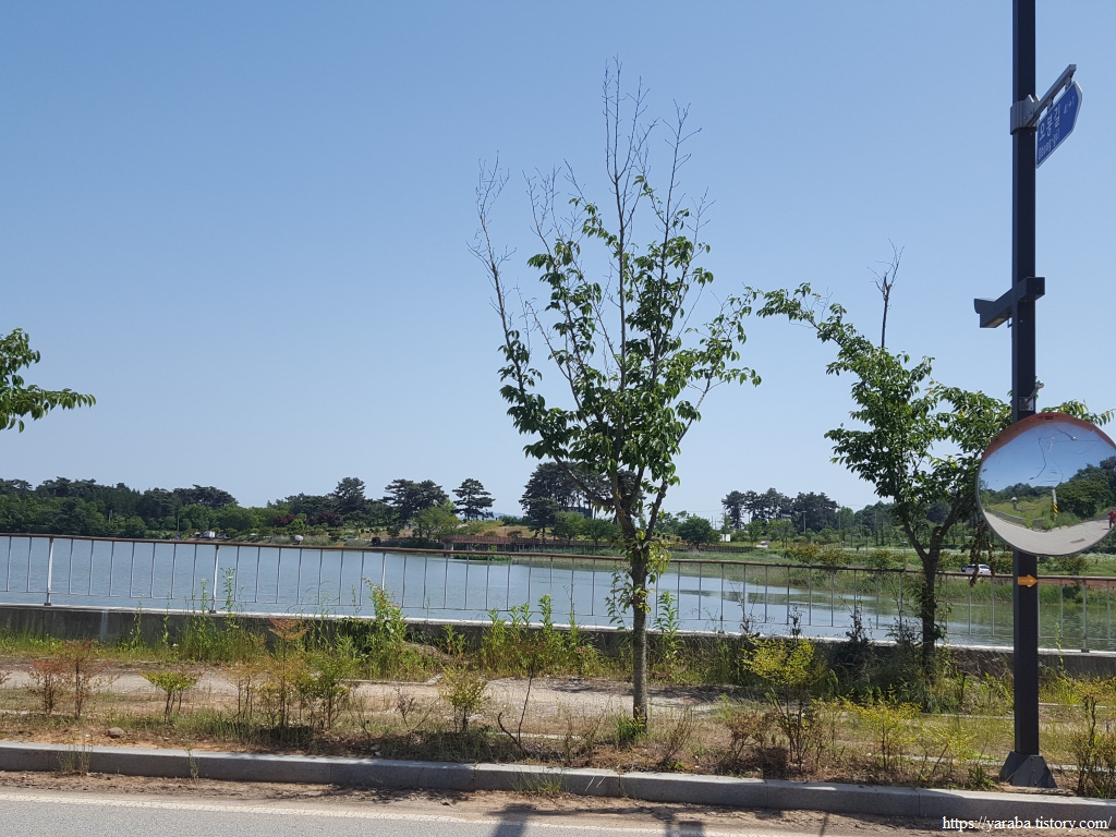 쌍구마을 대나무 숲길을 지나면 고마제 저수지에 시야에 들어오기 시작한다.