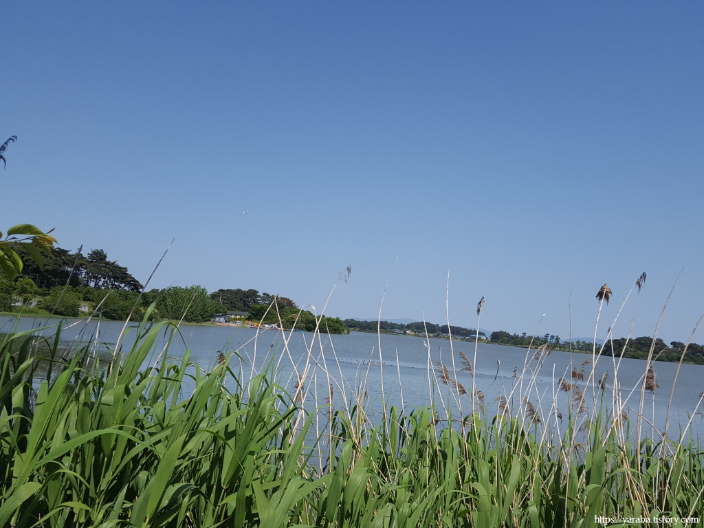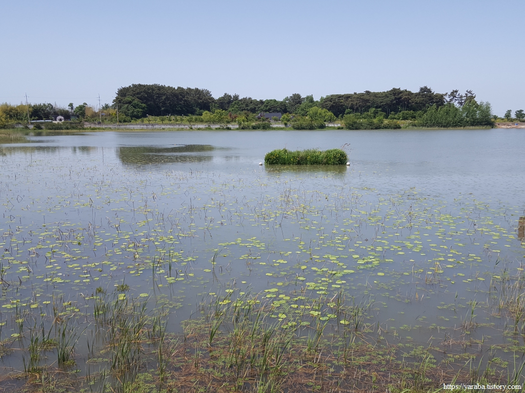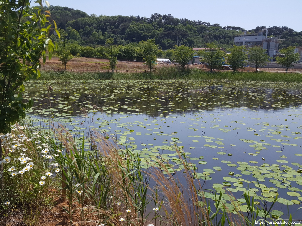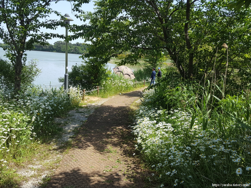 고마제윗길 도로를 서쪽으로 따라가다가 호수 산책로로 진입한다. 입구에서 샤스타데이지가 우리를 밝게 맞이한다.