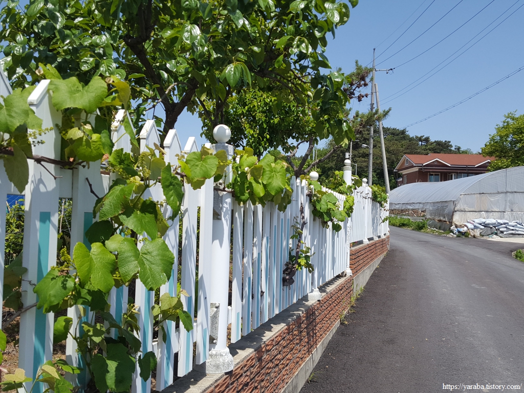 석정문학관 앞을 지난 길은 마을 골목길을 가로질러 고갯길을 넘는다. 집 울타리 나무에 포도 덩굴을 정성스레 엮어놓은 주인장의 정성이 엿보이는 집도 지난다.