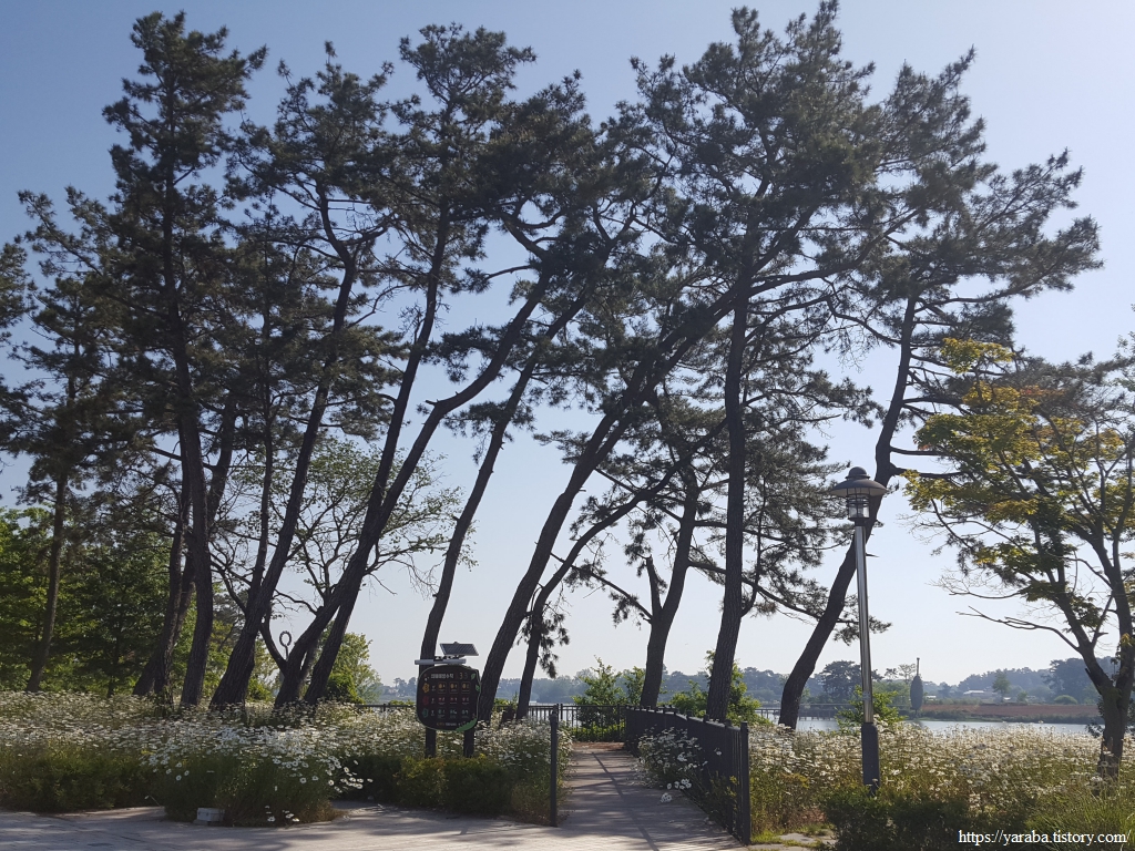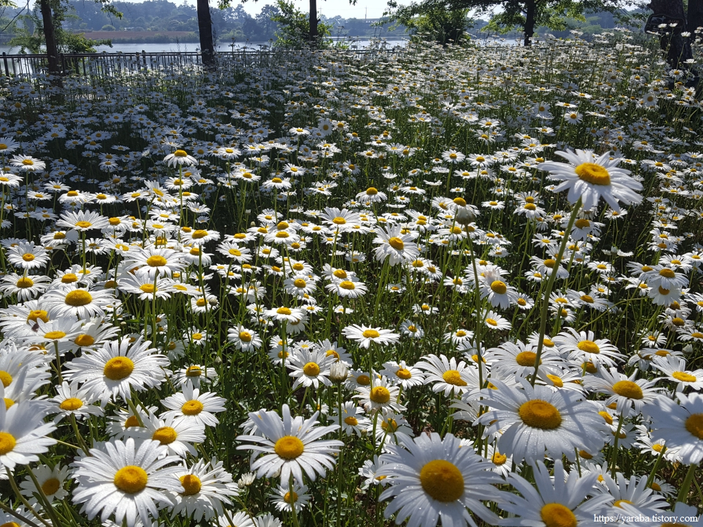 아침 햇살을 받은 샤스타데이지가 호수변을 하얗게 수놓았다. 아침햇살을 받아서 그런지 더욱 화사하다.