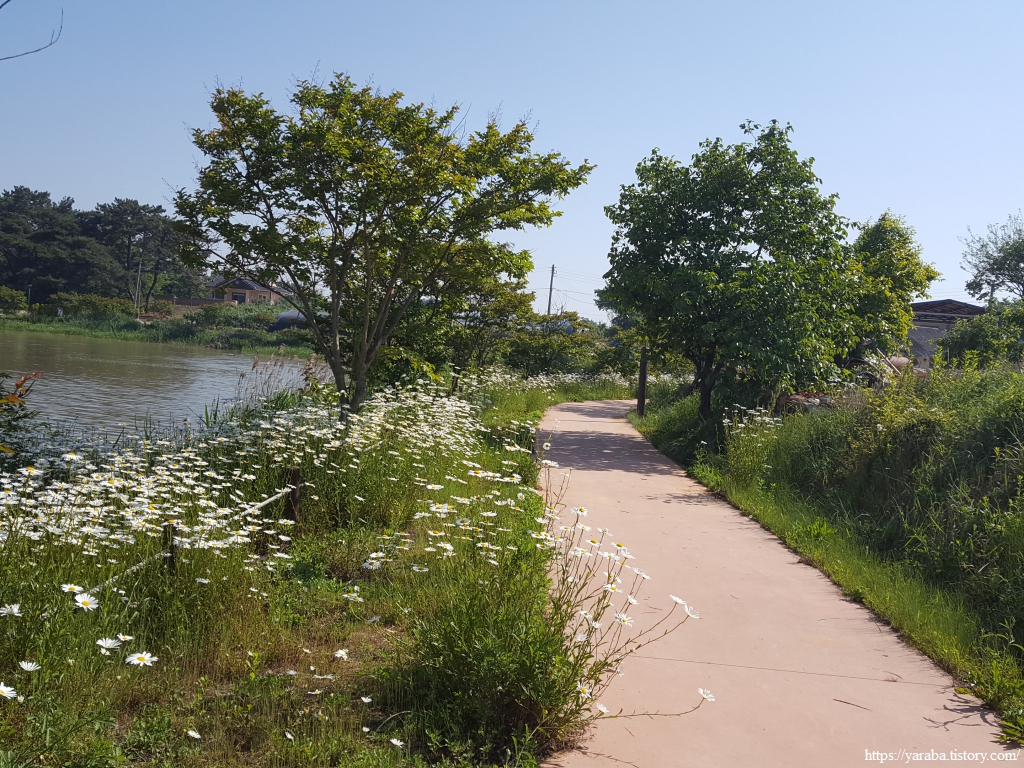 꽃과 나무들, 푸른 하늘을 담고 있는 저수지와 함께 걷는 산책길은 마음에 평화를 가져다준다.