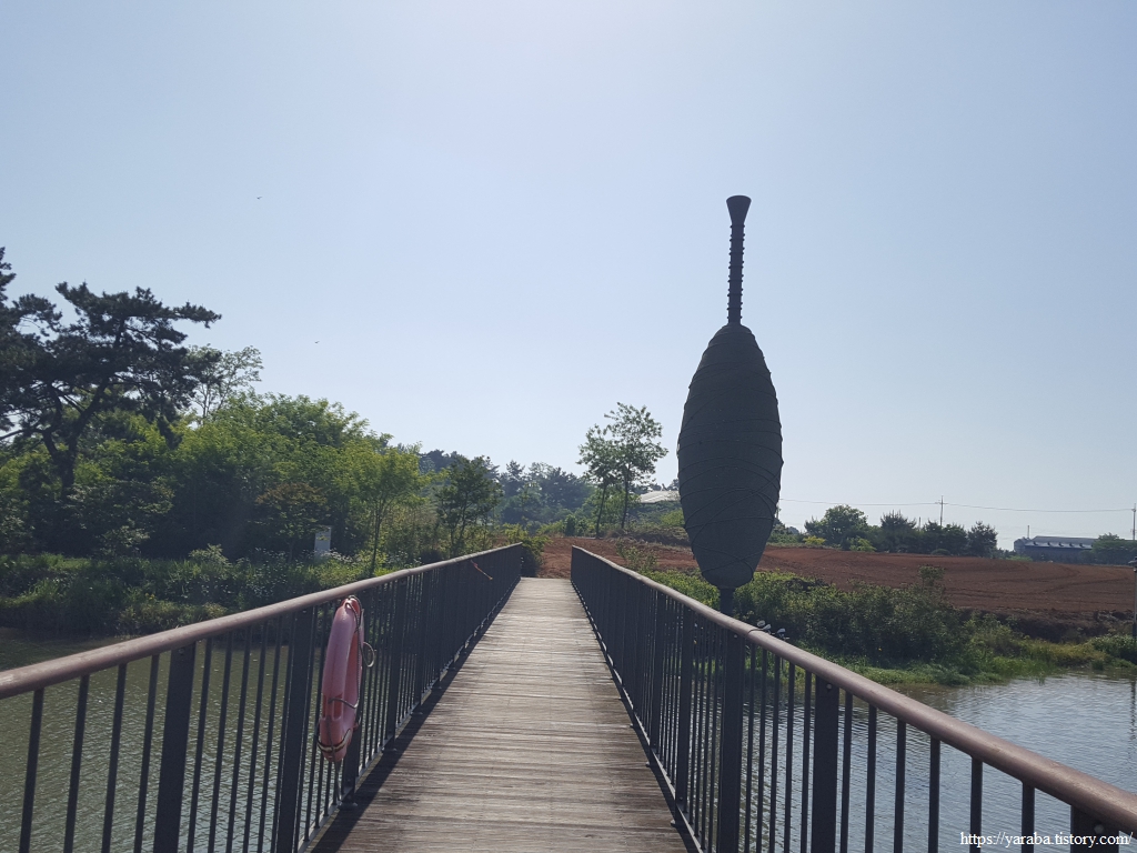 길은 호수 위를 가로지르는데 이름하여 못줄다리이다. 지금은 거의 대부분 이앙기가 모내기를 대신하고 있지만 이앙기가 없던 시절에는 모를 가지런히 심기 위하여 논 양쪽으로 줄을 치고 줄을 따라서 모를 심었었다. 실을 감아 놓는 실패처럼 못줄을 형상화한 조형물이 인상적이다. 매년 작은 논에 직접 손으로 모내기를 하고 있는 필자의 입장에서는 더욱 반가운 모습이지만 우리 농촌에서는 사라지고 있는 모습이기도 하다.