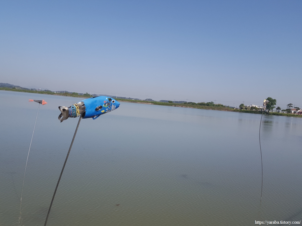커다란 논 양쪽에 못줄을 쳐 놓은 것처럼 호수 양쪽으로 조형물을 세우고 둘 사이로 다리를 설치하니 다리가 모를 심는 못줄처럼 보인다. 못줄다리 맞다!