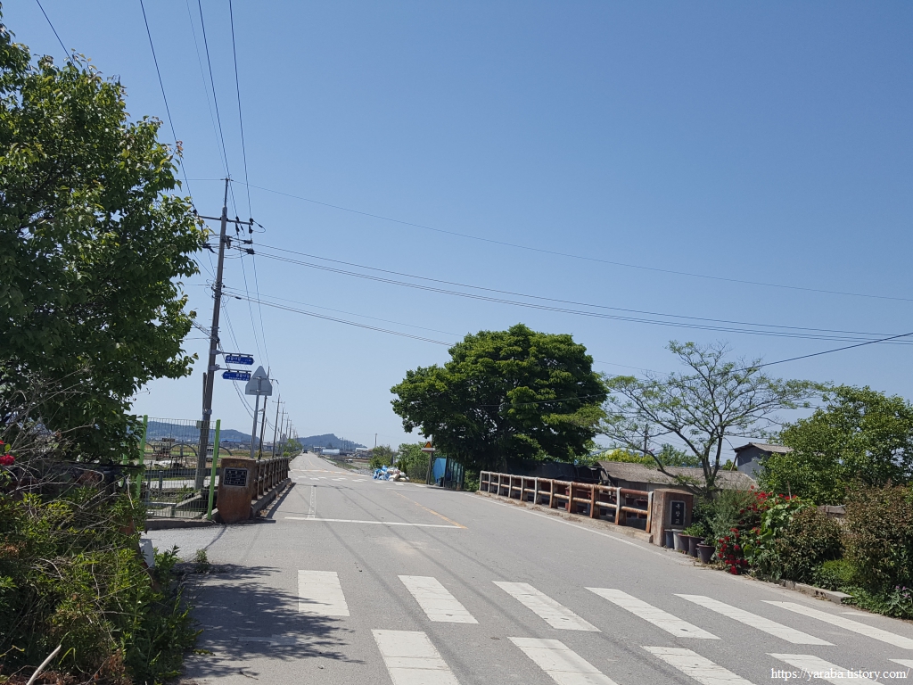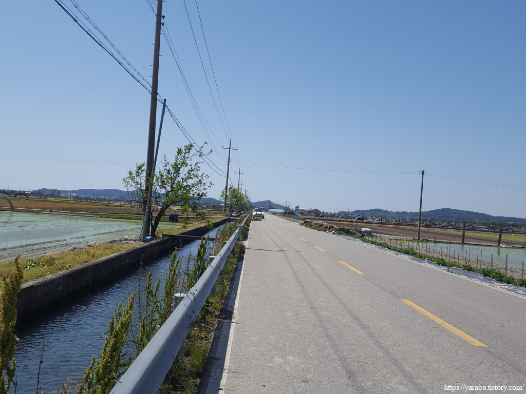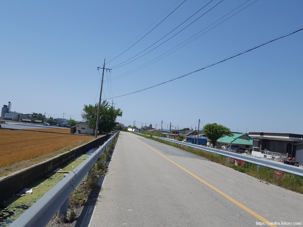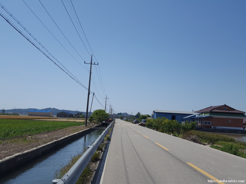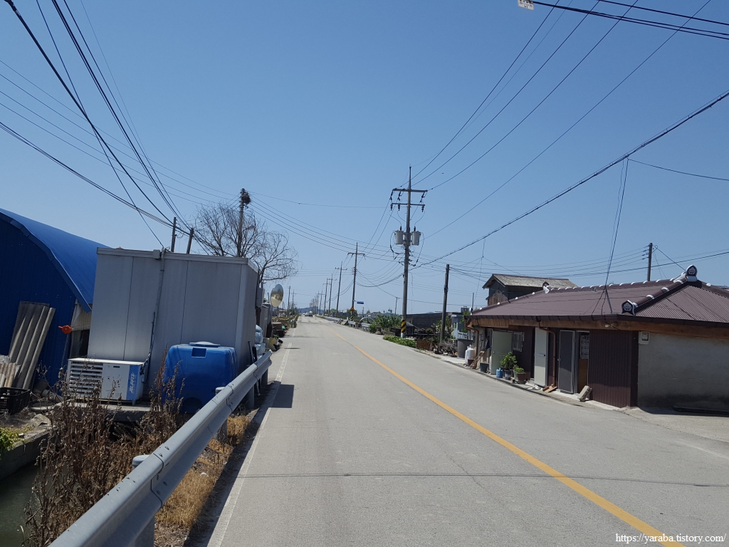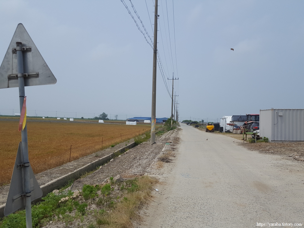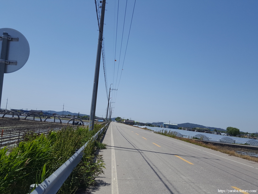약간의 배려도 없이 쏟아지는 뙤약볕 아래에서 광활로를 걸어간다. 원래의 서해랑길로 갔다면 시야에 들어오는 것은 온통 들판뿐이었을 텐데 광활로 도로를 걸으니 그나마 이따금씩 마을을 만나면서 이곳에 사는 사람들의 생활상을 살짝 볼 수 있어 좋았다. 진흥마을을 지나간다.