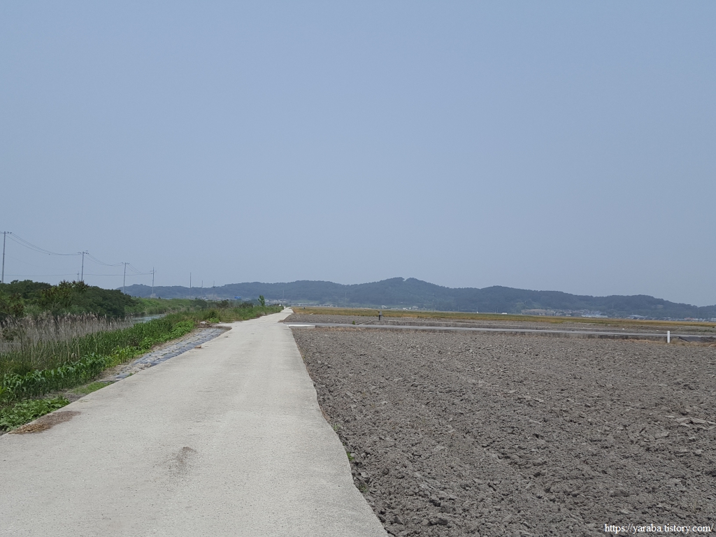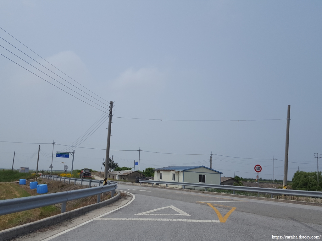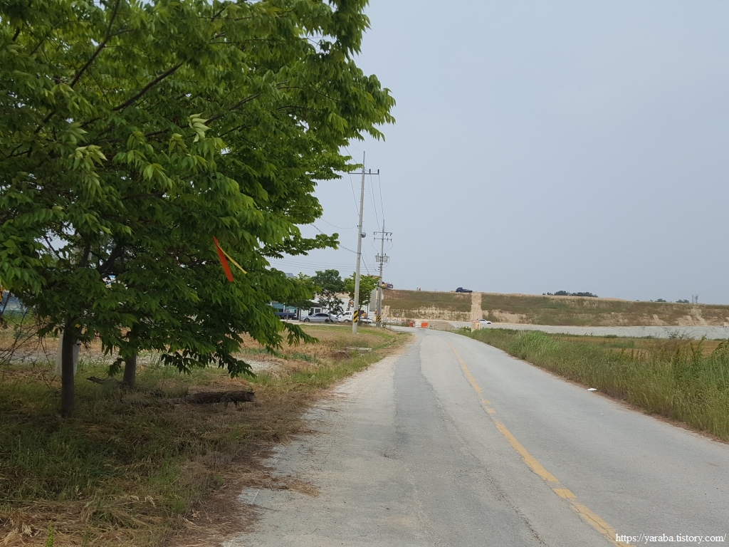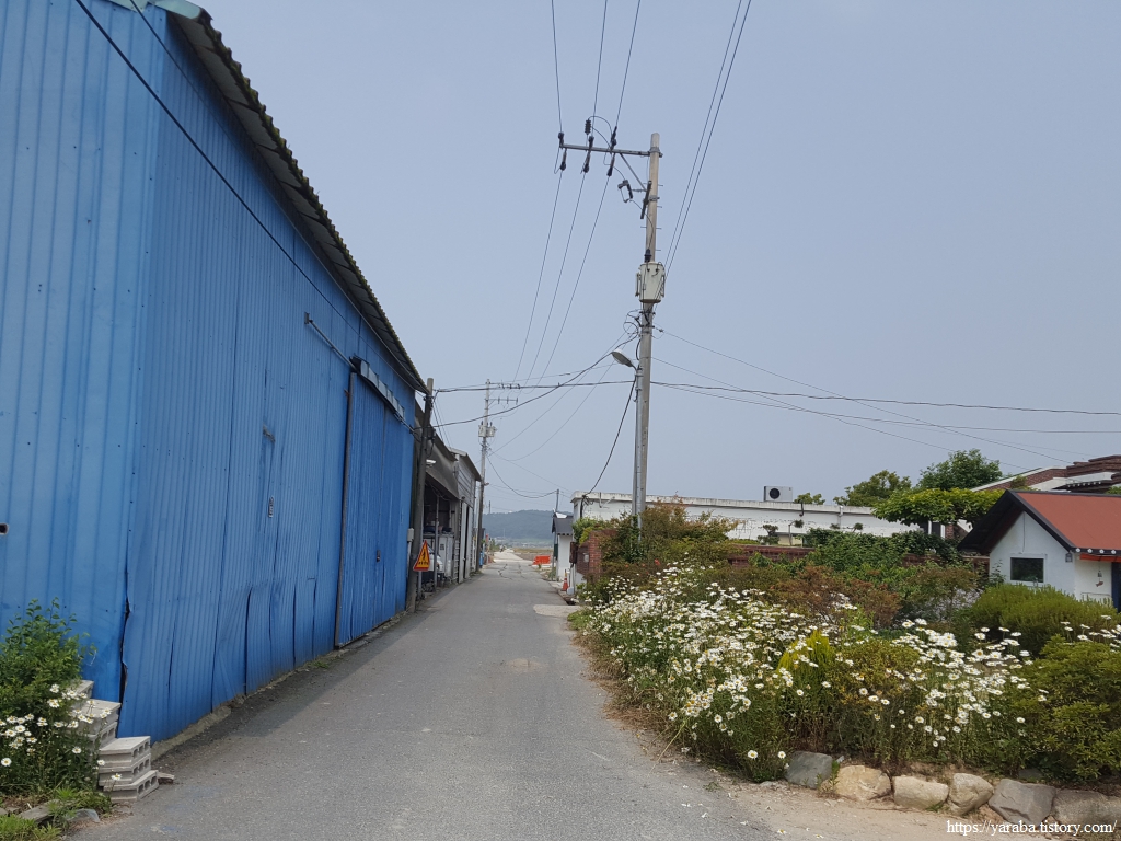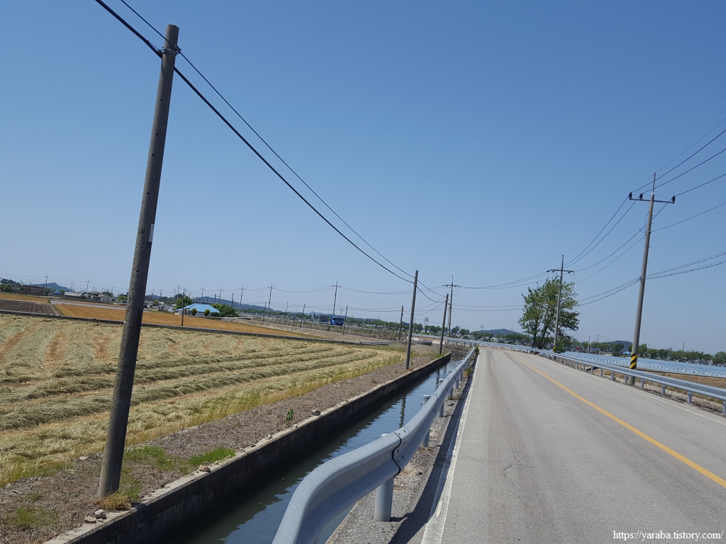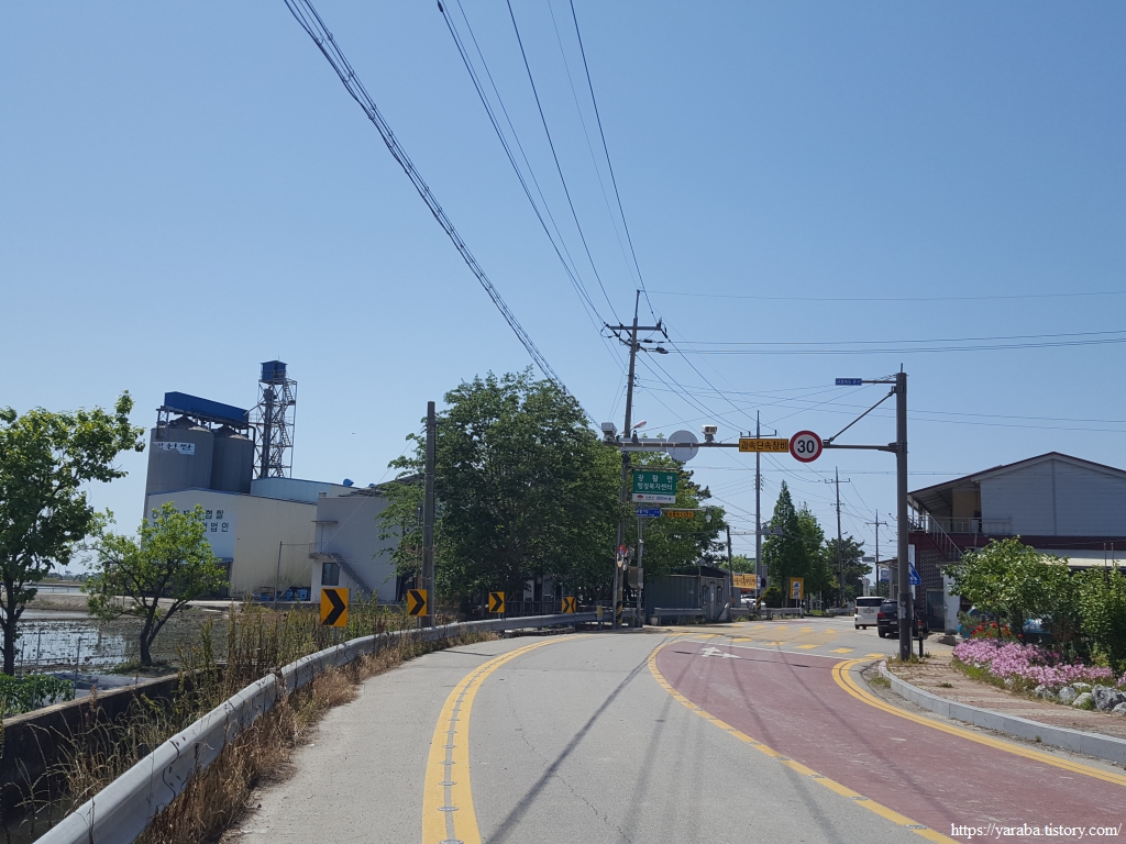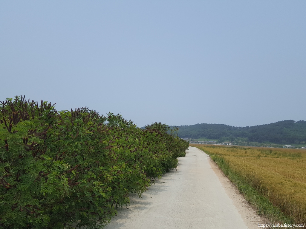 약간의 배려도 없이 쏟아지는 뙤약볕 아래에서 광활로를 걸어간다. 원래의 서해랑길로 갔다면 시야에 들어오는 것은 온통 들판뿐이었을 텐데 광활로 도로를 걸으니 그나마 이따금씩 마을을 만나면서 이곳에 사는 사람들의 생활상을 살짝 볼 수 있어 좋았다. 진흥마을을 지나간다.