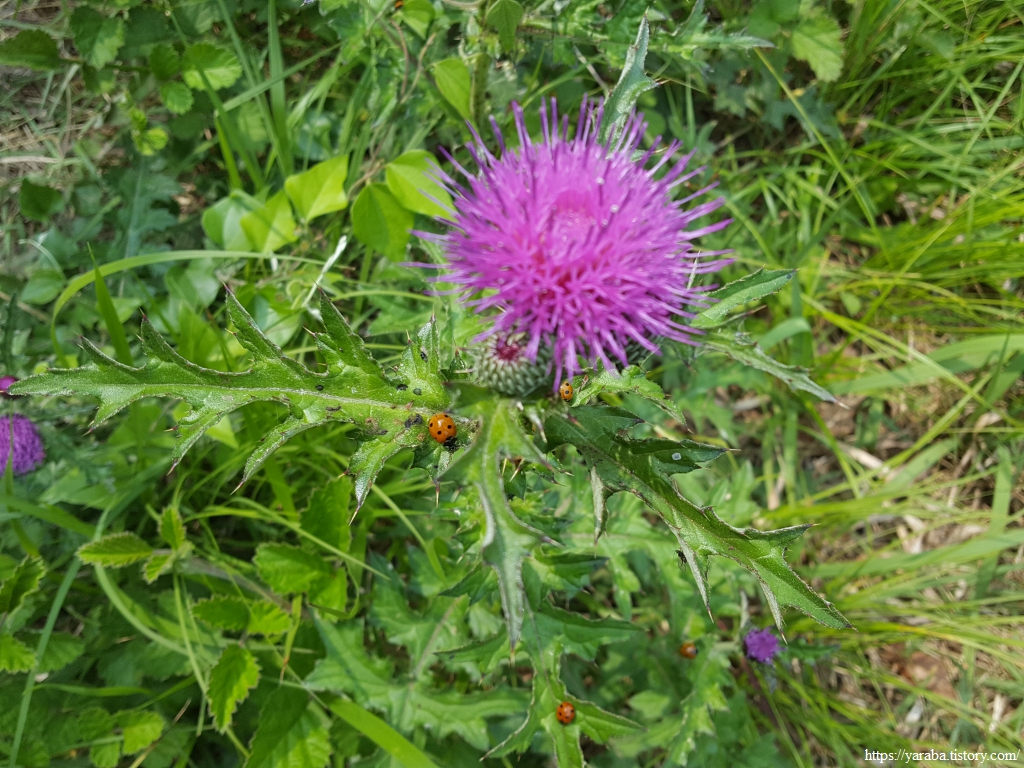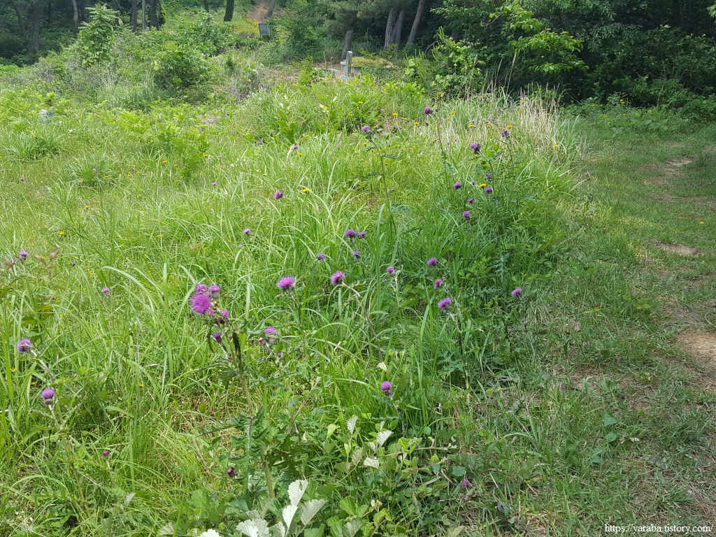 야산에 보라색 엉겅퀴가 군락을 이루었다. 피를 엉기게 해서 엉겅퀴라는 말도 있는데 한방에서도 지혈제로 사용하는 풀이다. 유럽이나 북미의 밀크시슬도 엉겅퀴 계통으로 간에 좋다고 알려져 많은 건강보조 식품에 사용되고 있다. 꽃부터 뿌리까지 모두 약용으로 사용된다고 한다.