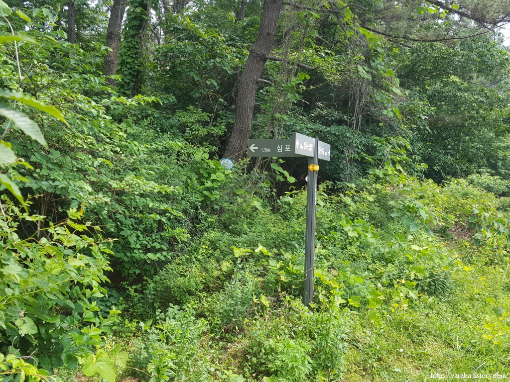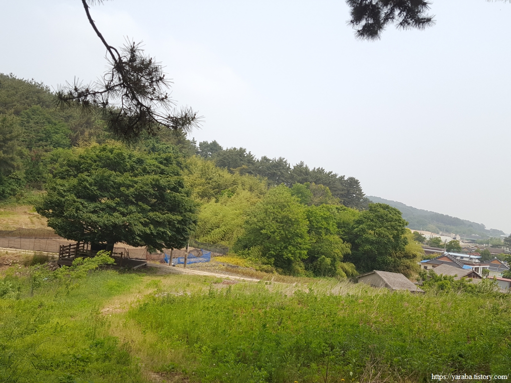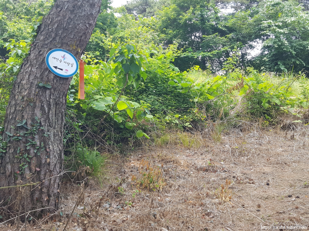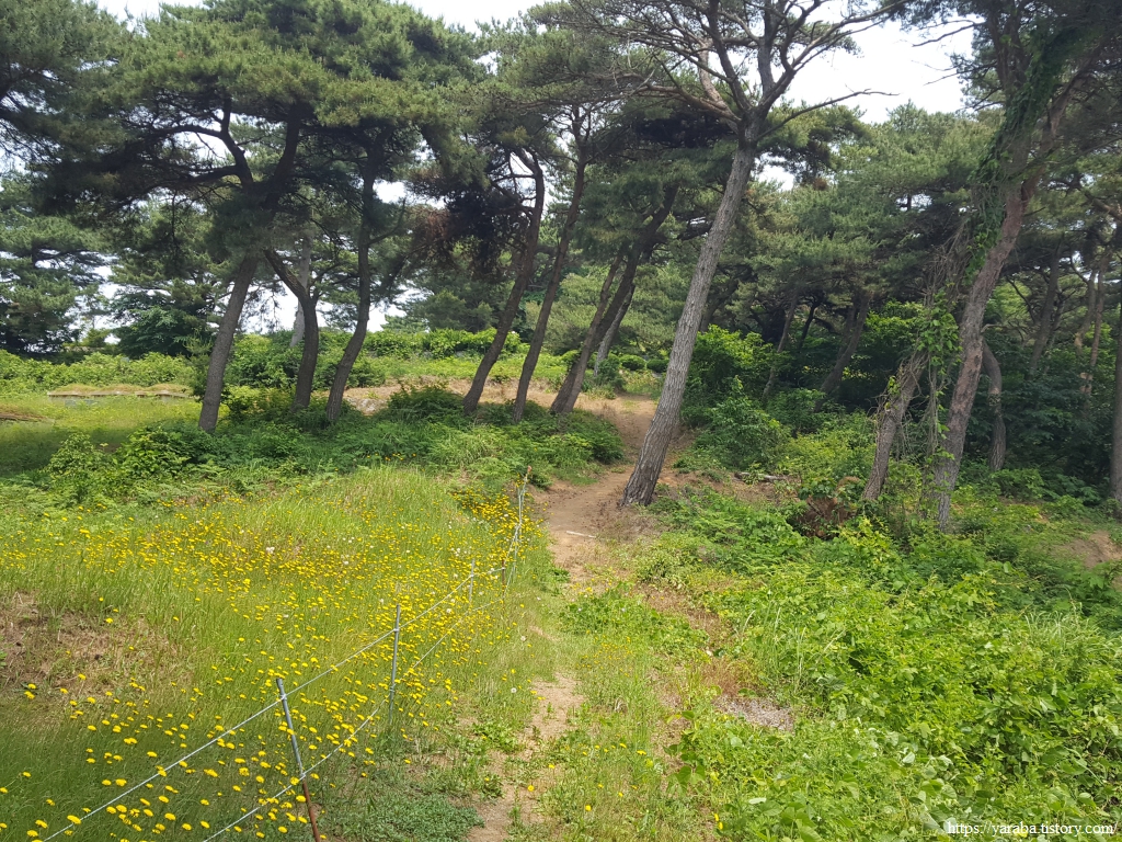 어느덧 길은 봉화산을 내려와 안하마을 갈림길에 도착했다. 커다란 나무 아래 쉼터에서 봉화산과 안행산 사이의 계곡으로 불어오는 바람을 맞으며 잠시 쉬어간다. 나무가 있는 갈림길에서 좌측으로 가도 심포항으로 가는 길이 있지만 경로는 우측 안하마을로 돌아서 간다.