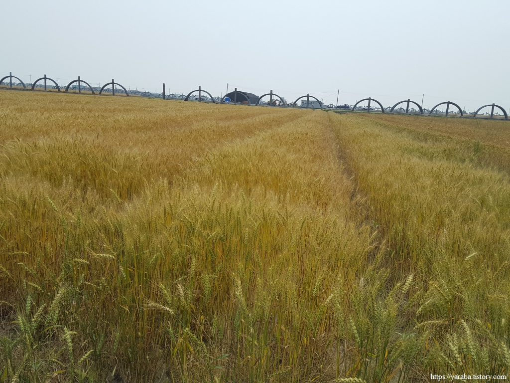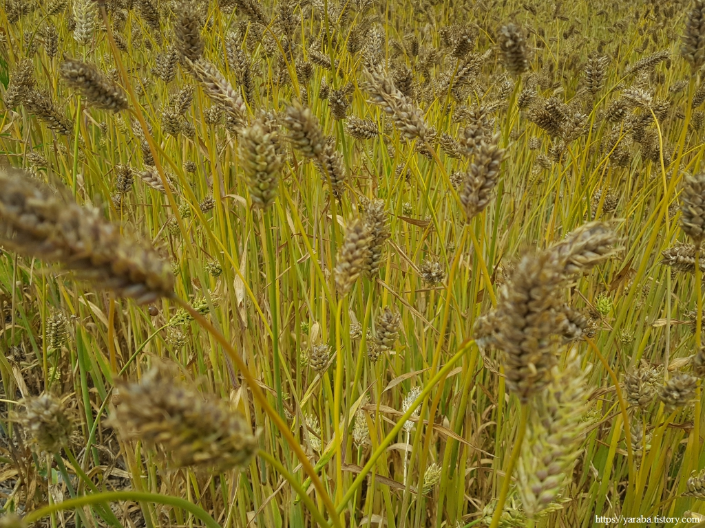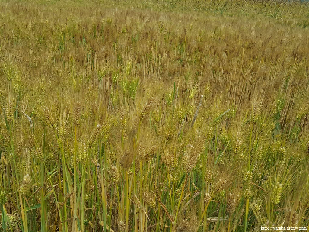 들판길을 걷다 보니 처음 보는 이상한 보리를 만났다. 까끄라기라고 하는 보리 수염이 없는 보리였다. 보리를 키워본 사람은 알겠지만 보리 수염은 사람에게 참으로 골치 아픈 존재이다. 동물들도 마찬가지라고 하는데, 사료용으로 활용하기 위해서 까끄라기를 퇴화시킨 품종이라고 한다. 표면이 부드러워 가축들이 좋아하고 쓰러짐에도 강하다고 한다. 유연보리, 우호보리라는 품종이 있다.