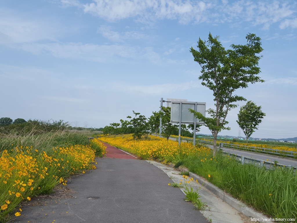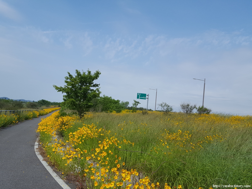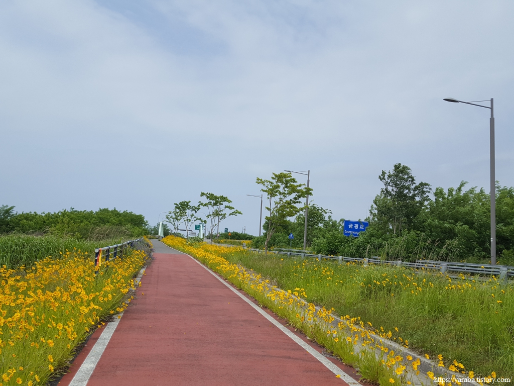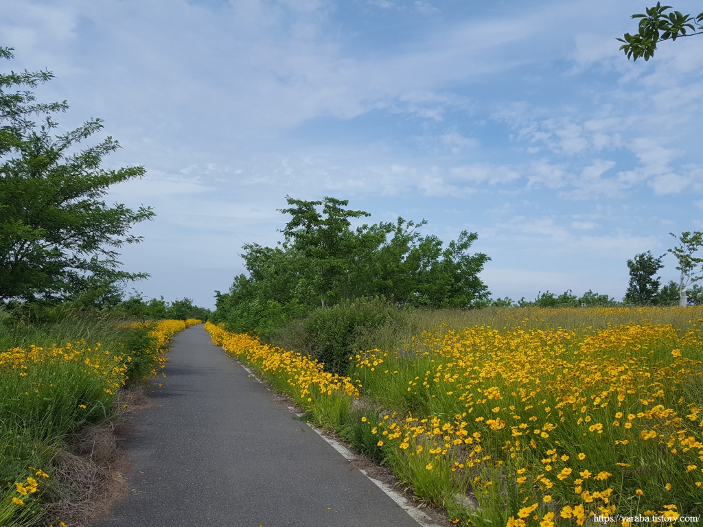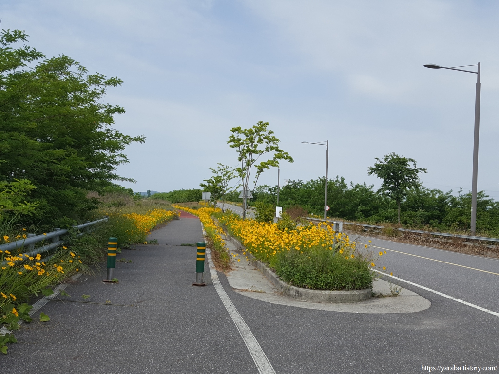 한반도 모양으로 만들었다는 새창이 연꽃 마당을 지나서 노란 금계국이 화려하게 길을 밝히고 있는 자전거길을 따라 걷기를 시작한다.