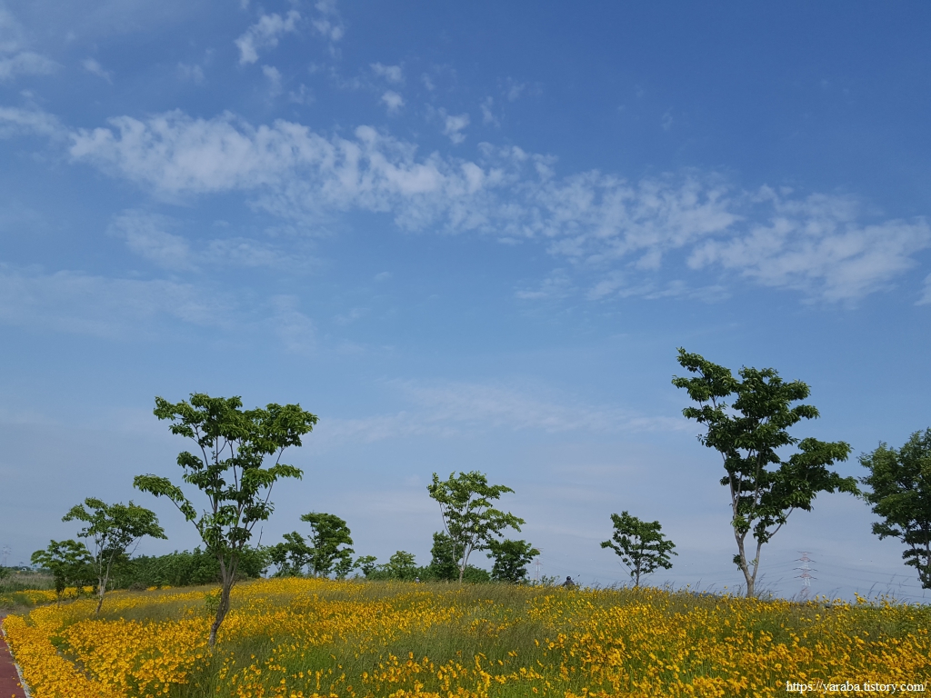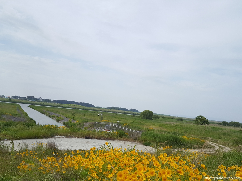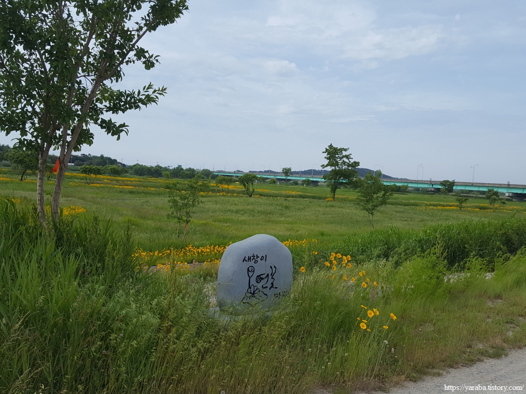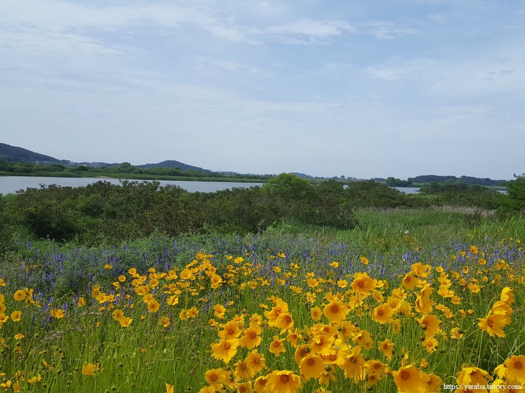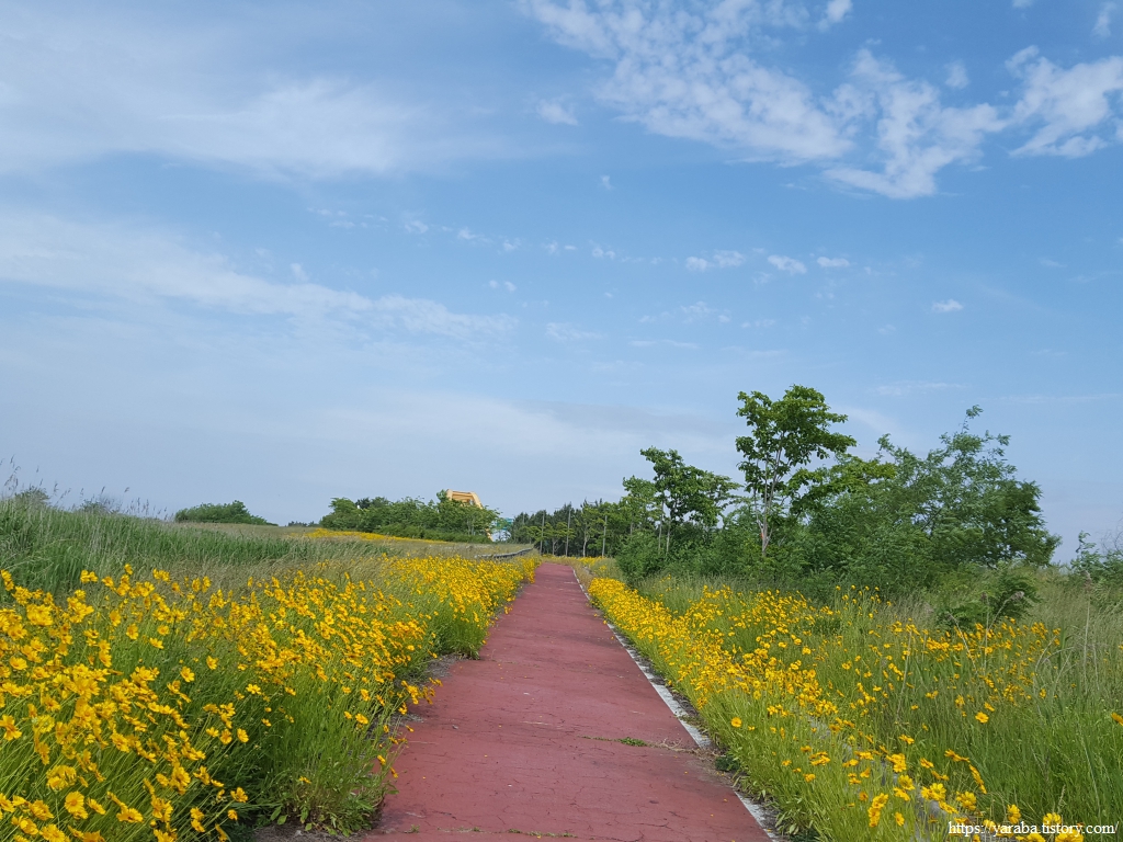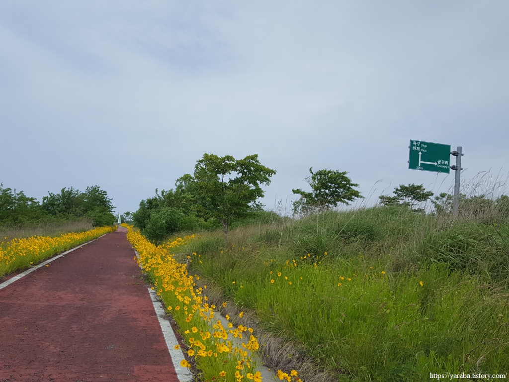 한반도 모양으로 만들었다는 새창이 연꽃 마당을 지나서 노란 금계국이 화려하게 길을 밝히고 있는 자전거길을 따라 걷기를 시작한다.