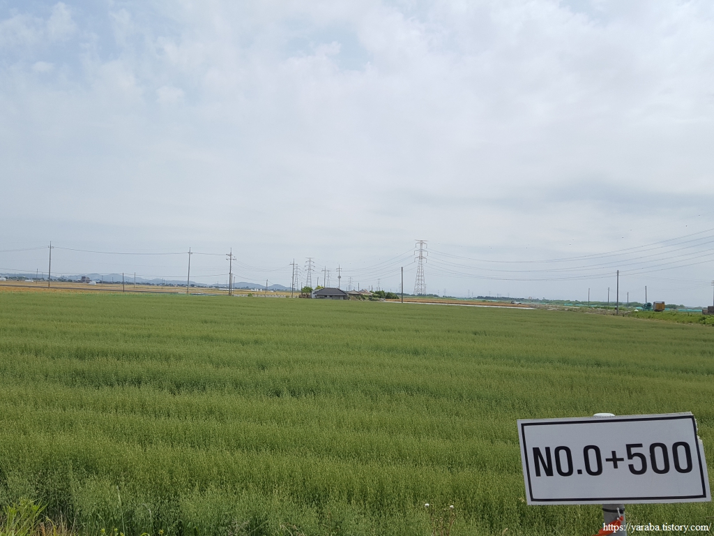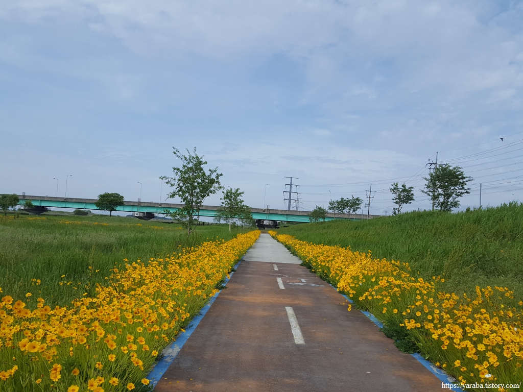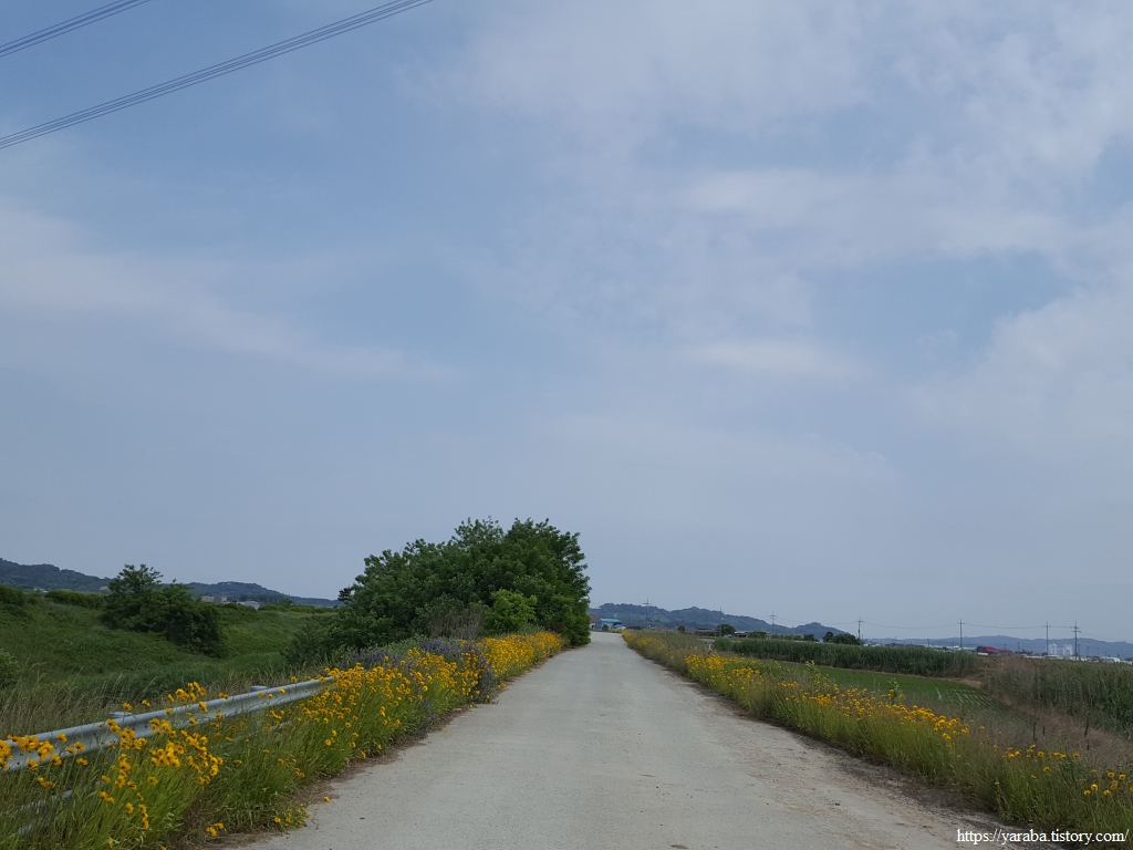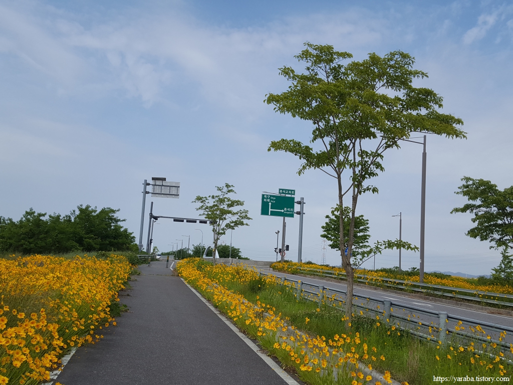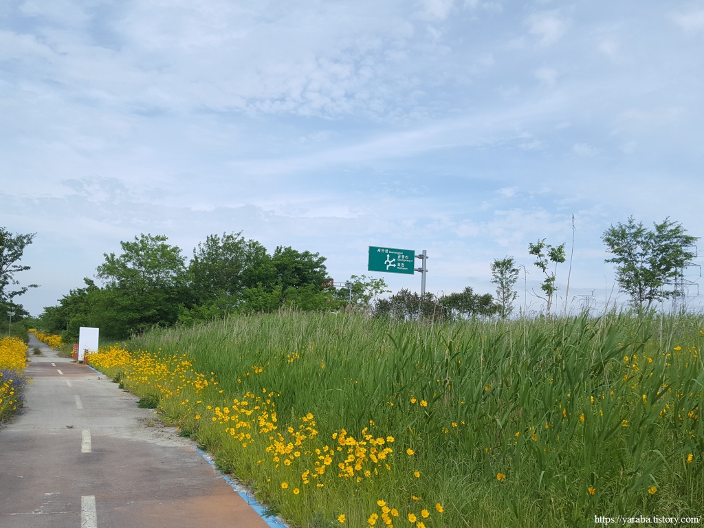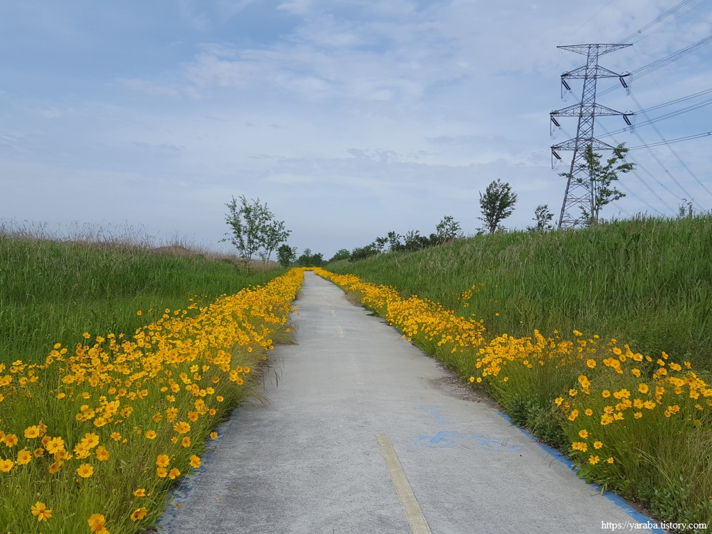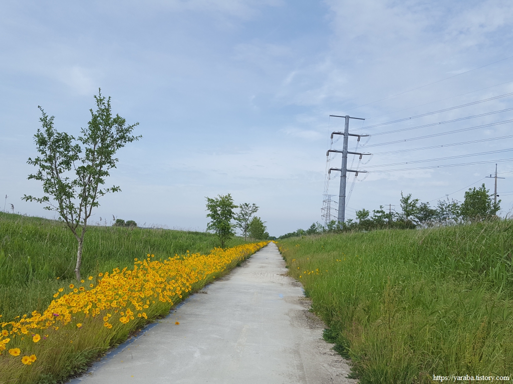깔끔하게 정비된 자전거길은 노란 금계국과 푸른 들풀들도 함께하지만 송전탑도 같이 간다.