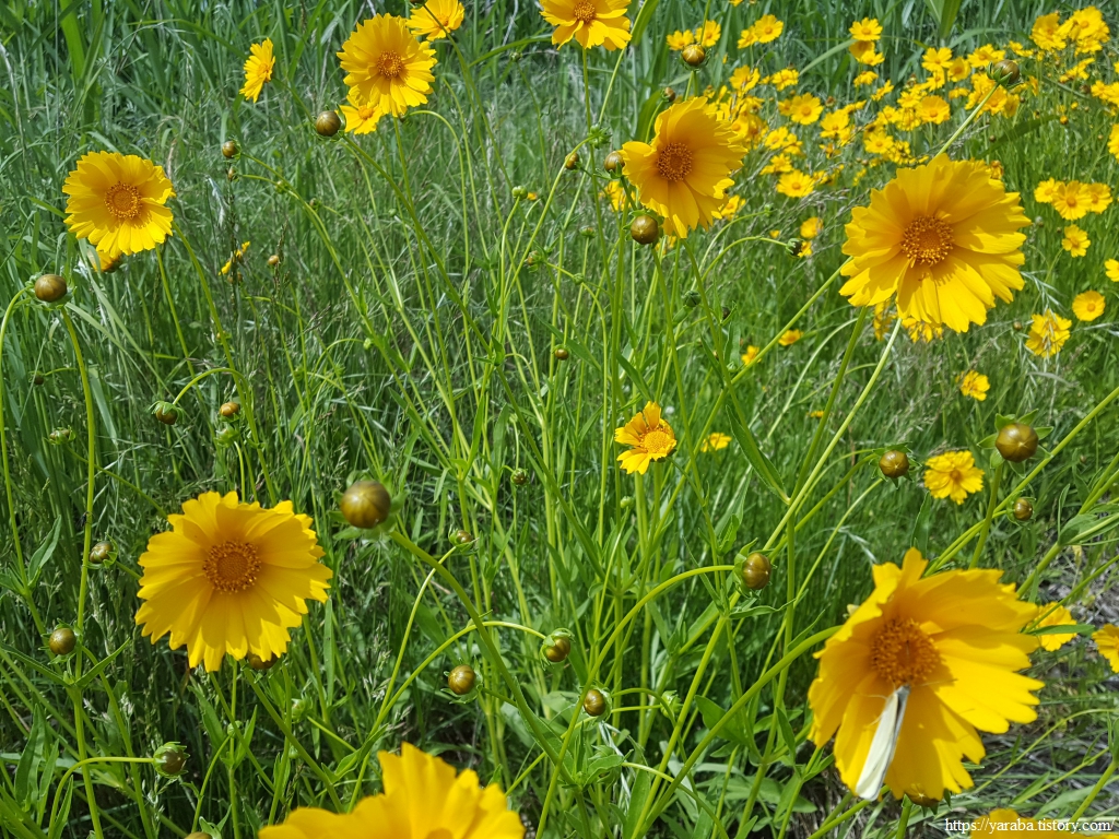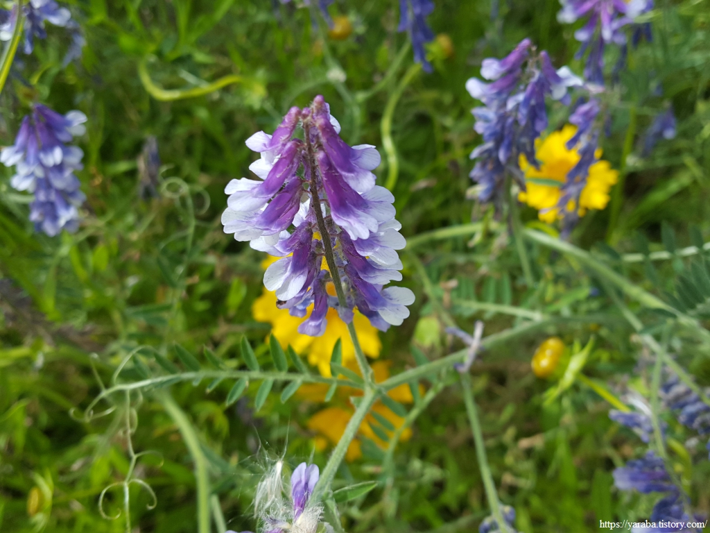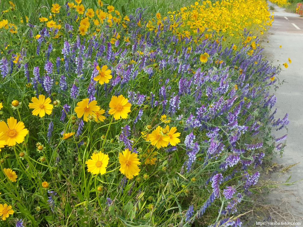 노란색 금계국 틈바구니에서 보라색 등갈퀴나물 꽃이 존재감을 뽐낸다. 그야말로 꽃들의 치열한 생존싸움이 벌어지고 있는 현장이 아닌가 싶다.