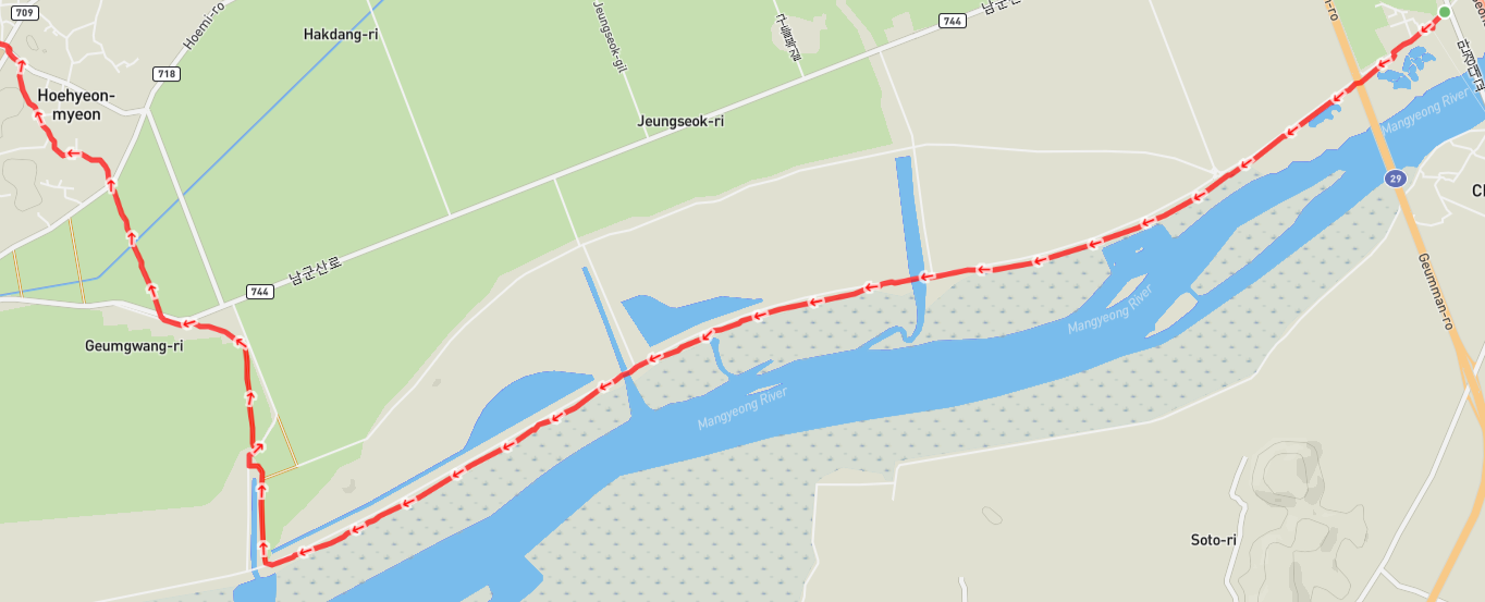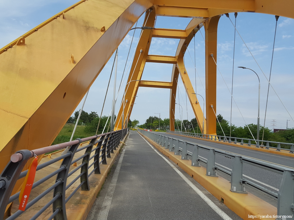 자전거길은 일부는 둔치에 조성한 전용 자전거길로 나머지는 도로를 통해서 새만금 방조제까지 이어진다. 새만금 방조제 내부로도 이미 동서남북을 가로지르는 도로망이 뚫려 있다. 29번 국도가 지나는 청하 대교 아래를 통과한다.