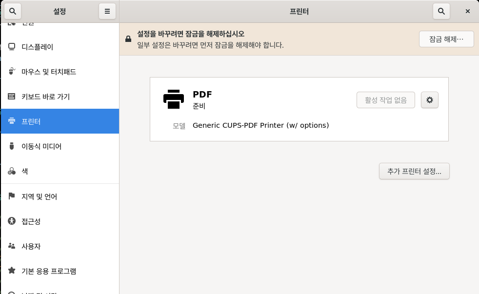 PDF 프린터 드라이버의 설치는 위의 그림처럼 sudo apt-get install cups-pdf 또는 sudo apt-get install printer-driver-cups-pdf 명령으로 수행한다.